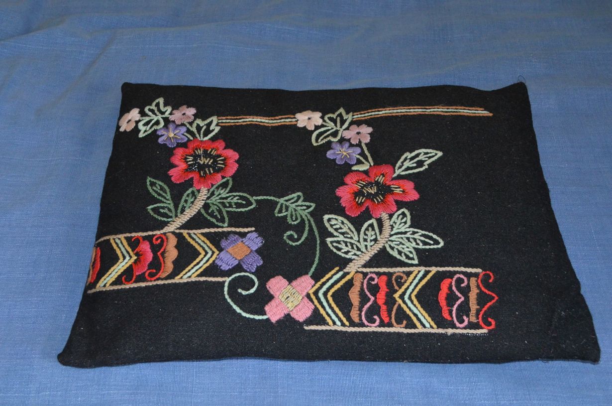 Paksulle mustalle huopakankaalle kirjailtu koristeellisen kaunis kukkatyyny, joka sopii sohvalle tai vakkapa rekityynyksi. Tyynyllä on ikää varmaan 50-vuotta ja se on äitini kirjailema.