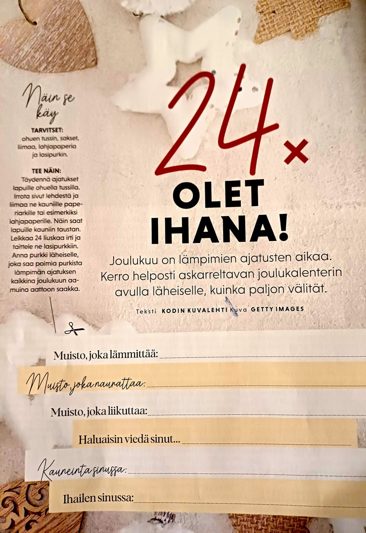Tämä Kodin Kuvalehden viime vuoden joulukalenteri idea oli loistava. Otin sivuista kopioita. Lapsenlapseni täyttivät sen äidilleen ja mieheni ja minä toisillemme. Viestit laitoimme kauniisiin joulupurkkeihin. Kauniita sanoja ja hyvää mieltä riitti meille kaikille! Tämän voisi vaikka uusia tänäkin vuonna, kiitos!