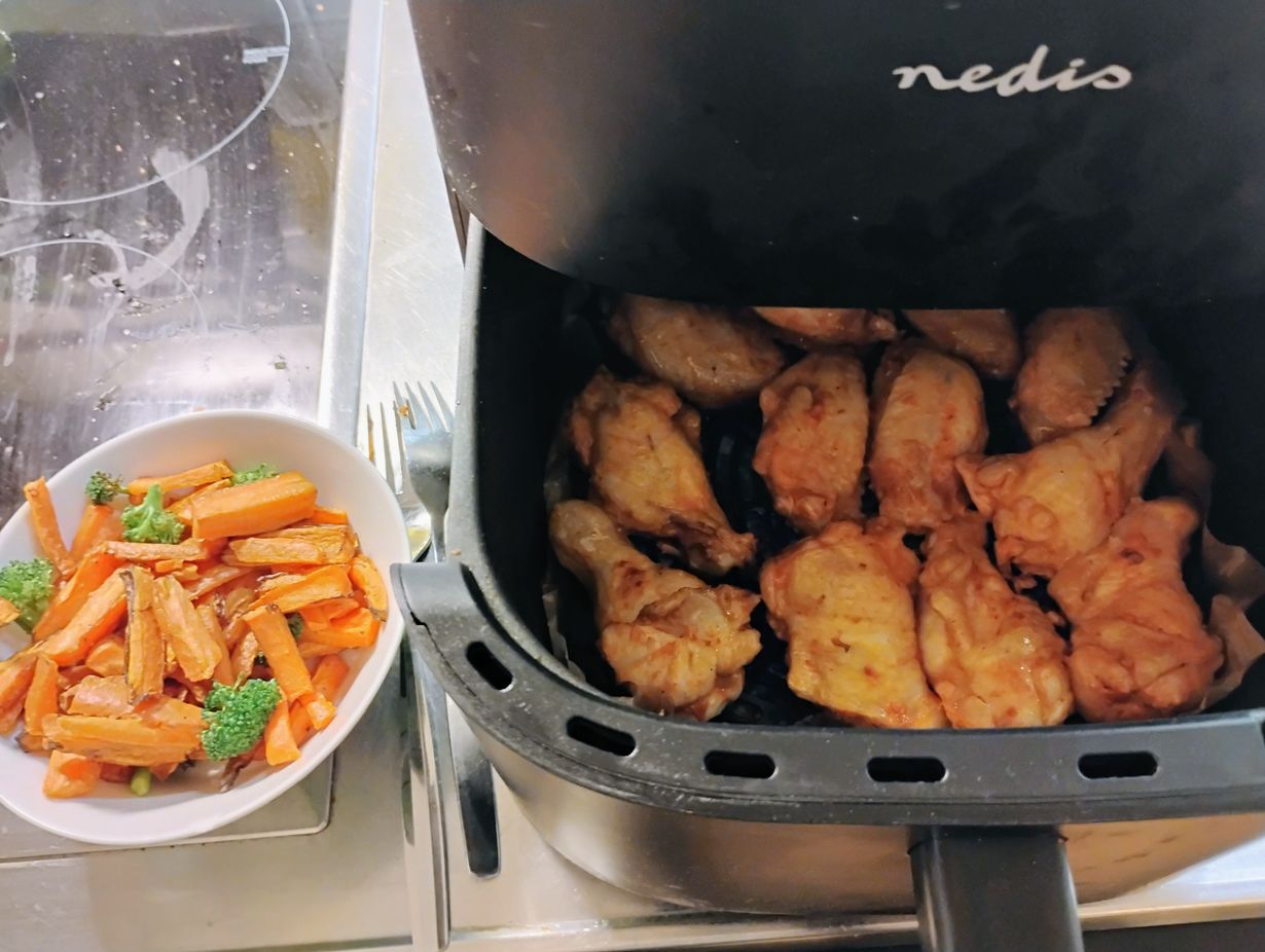 Airfryerissä onnistuvat kanan siivet ja koivet todellakin aina. Lisukkeena kuvassa on porkkanatikut ja parsakaali, jotka tehtiin airfryerissä ennen kanoja.
