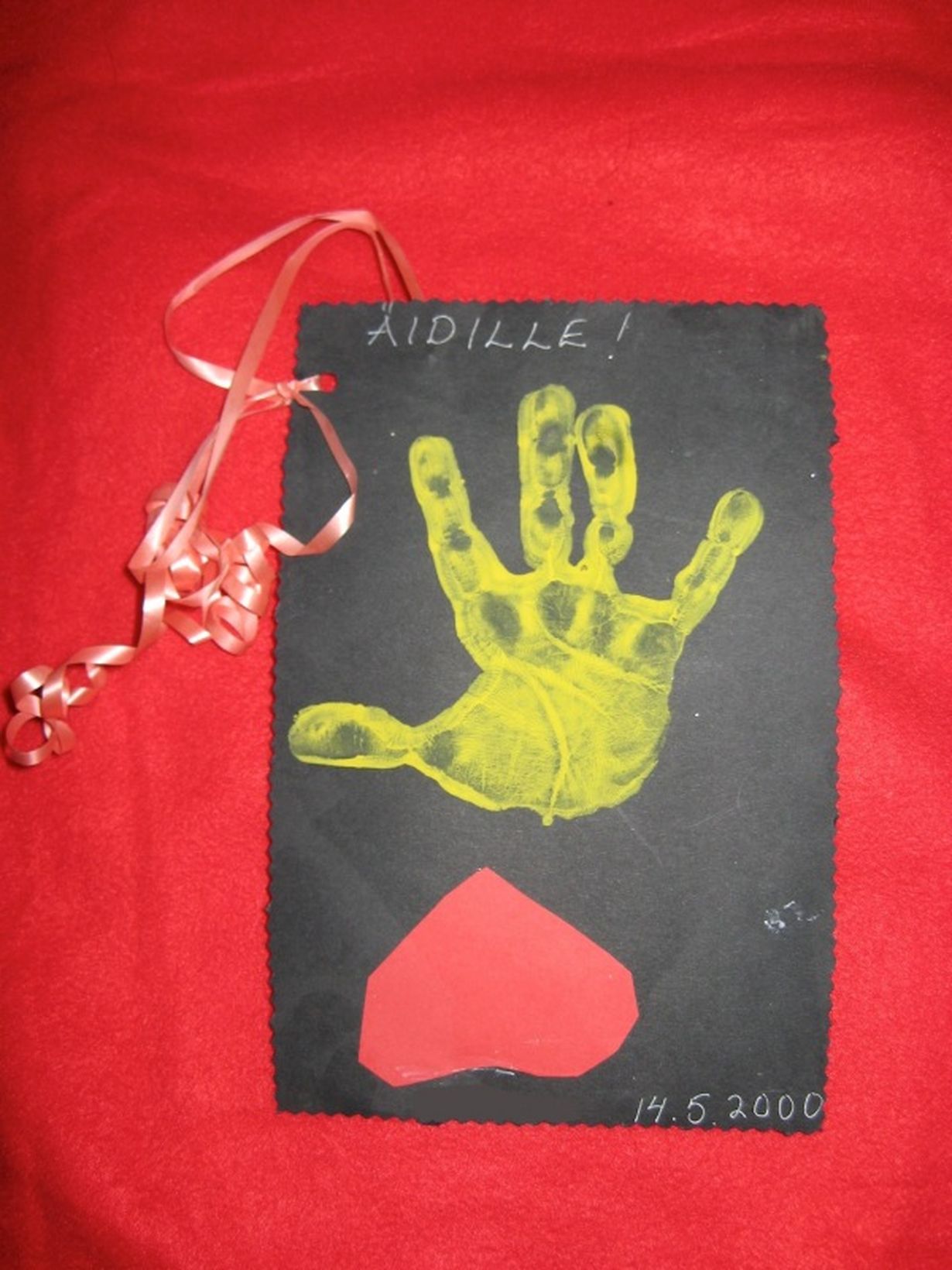 Oheinen äitienpäiväkortti on yksi rakkaimmista saamistani korteista. Poikani antoi sen minulle ollessaan vajaa 4v ja kortissa oleva käsi on nykyiseen käteen verrattuna tosi pieni. Myös itseleikattu sydän kortissa jaksaa aina liikuttaa.
