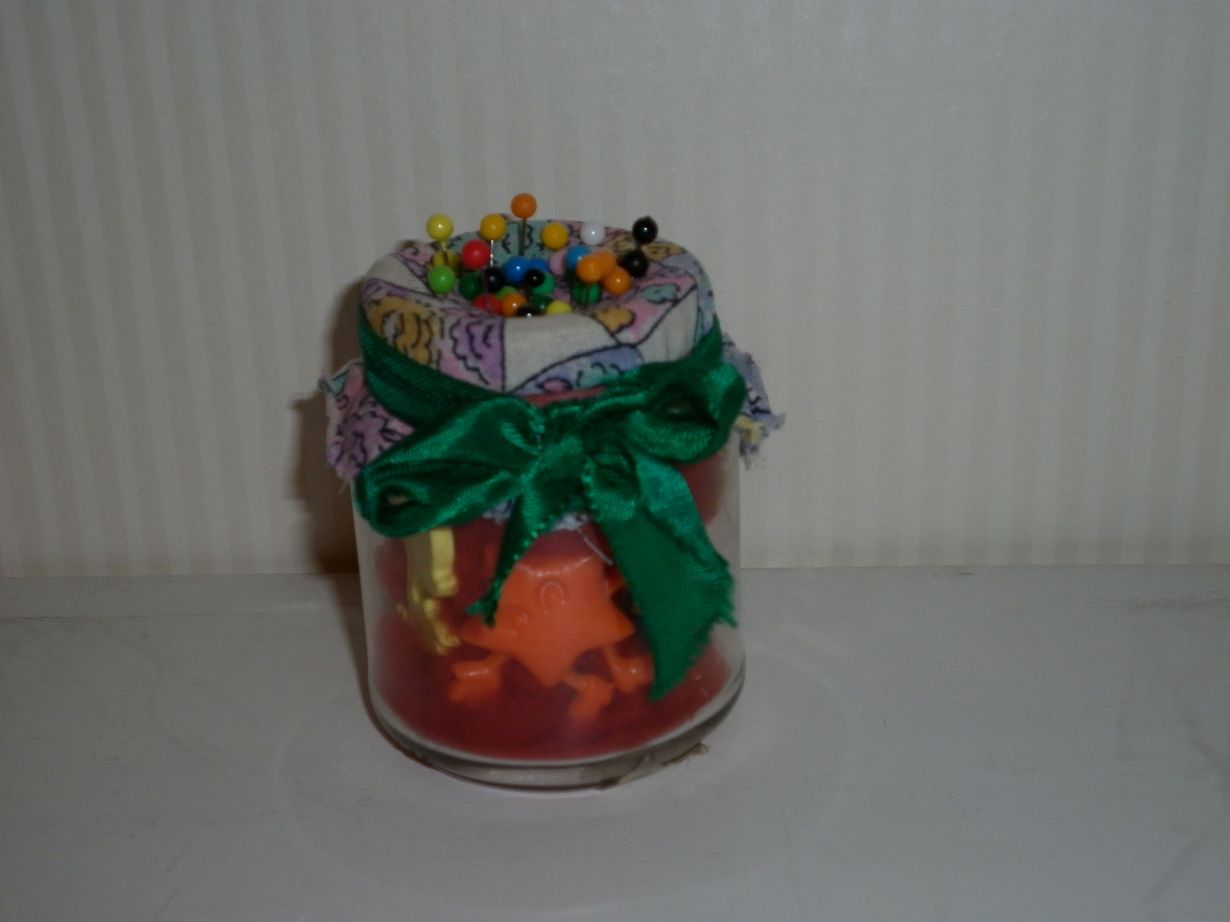 Neulatyynyni on jo useita vuosia vanha! Poikani päiväkodissa pilttisosepurkista askartelema äitienpäivälahja. Ihana muisto ja oikeastikin hyvin neulatyynynä toimiva ja paljon käytetty!