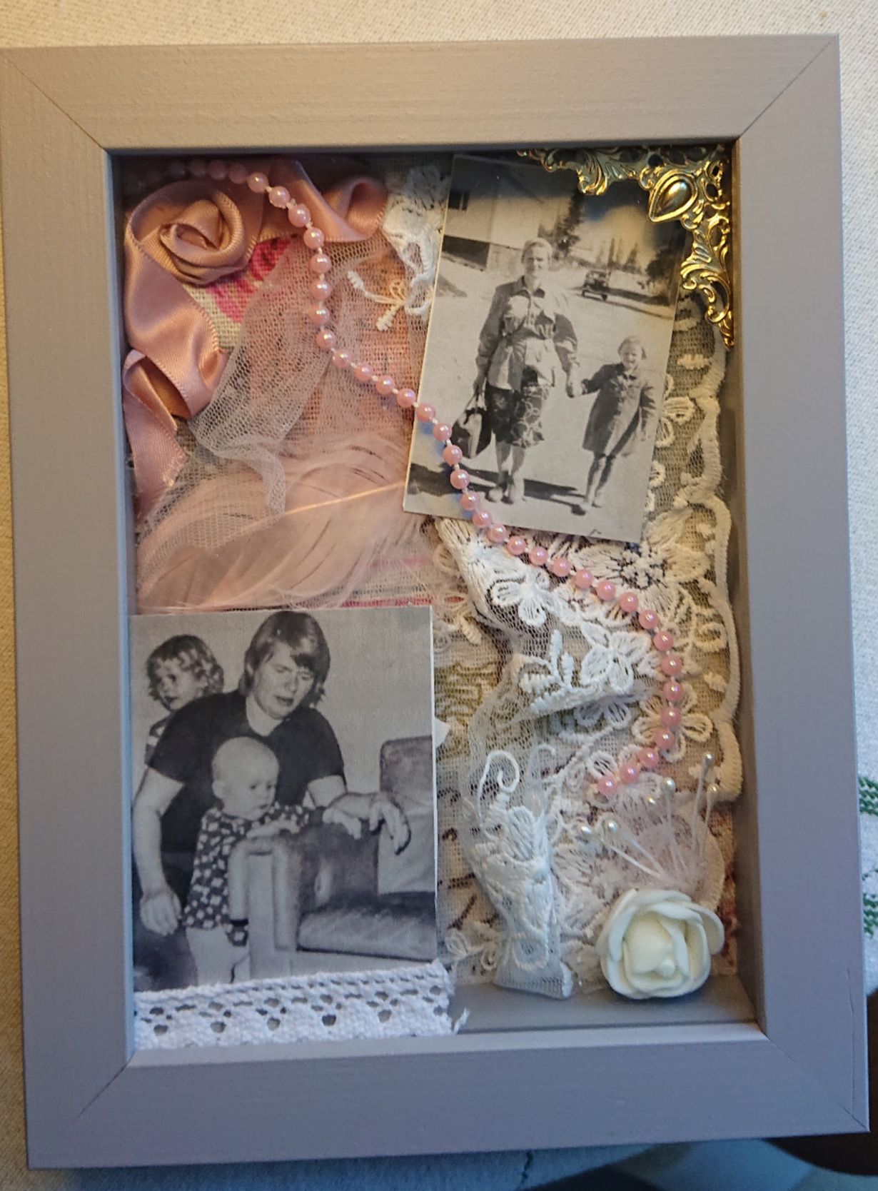 Taulu muistokuvista äidilleni äitienpäivälahjaksi. Taulussa on kuvat vuosien takaa sekä omasta lapsuudestaan oman äitinsä kanssa että minusta lapsena hänen kanssaan. Koristelun taulun äitini sisustukseen sopivaksi.