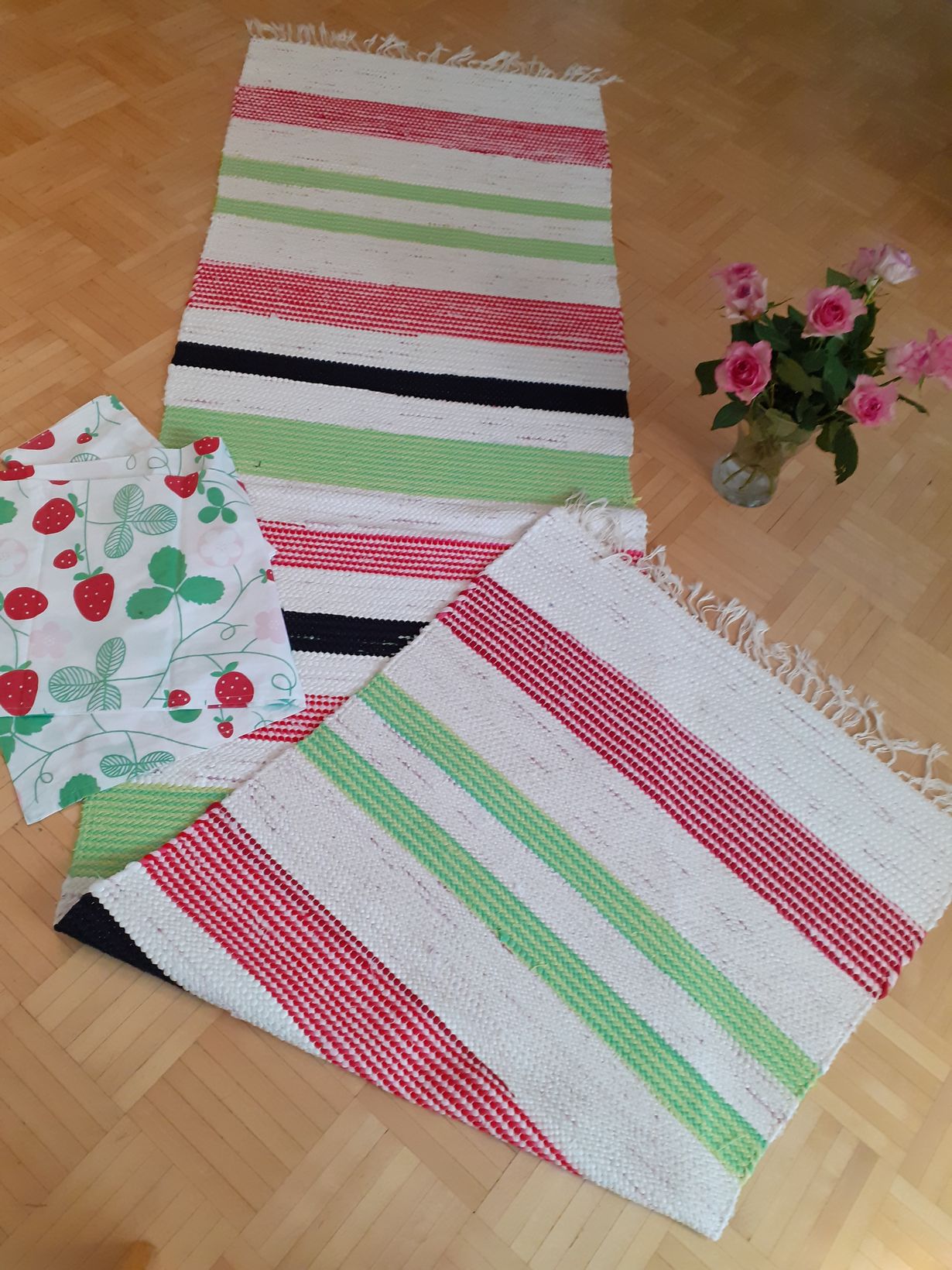 Sain taitavalta tyttäreltäni äitienpäivälahjaksi tuon hänen itse kutomansa maton, väritoive oli, että matto sointuu noihin apilaverhoihin kesähuoneeseen. Maton värit on pirteät ja tuovat hyvälle mielelle. Pidän mattoa talvisin vierashuoneessa.