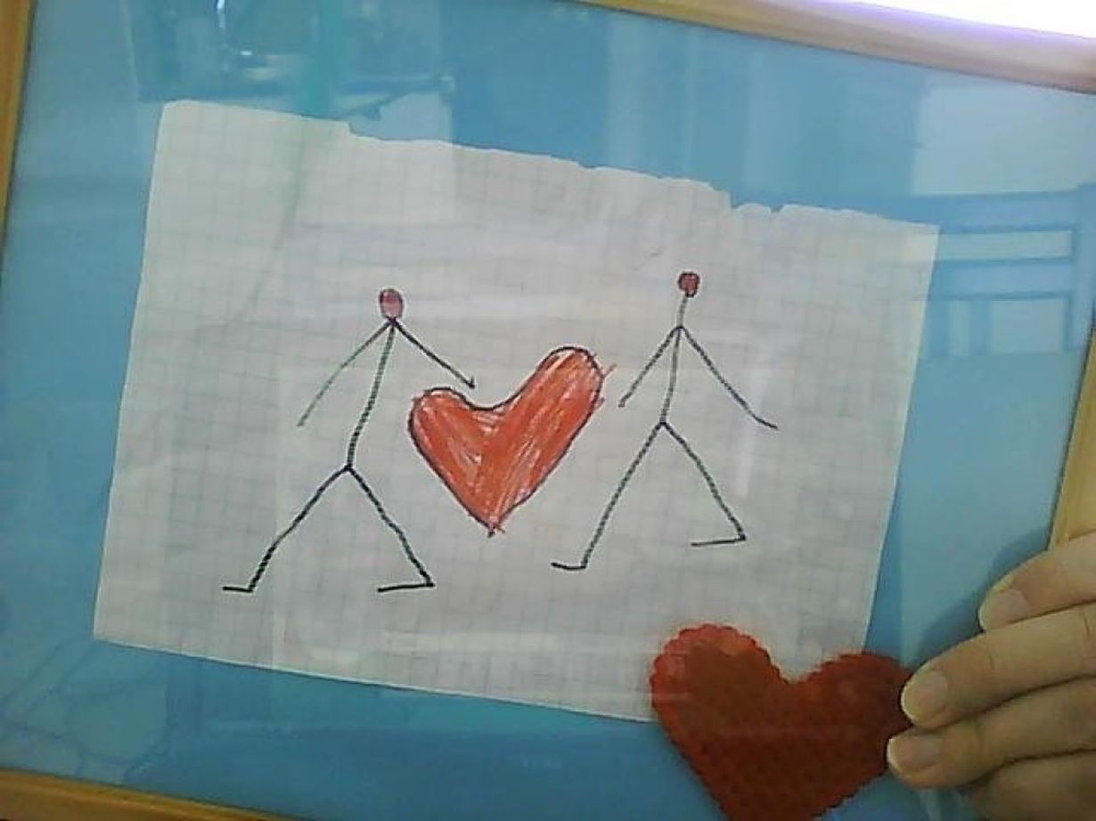 Tämän piirsi poikani Antti 6-vuotiaana minulle äitienpäivän kunniaksi. Iso sydän meidän välissä kuvaa (hänen omia sanojaan lainatakseni) suurta rakkauttamme.