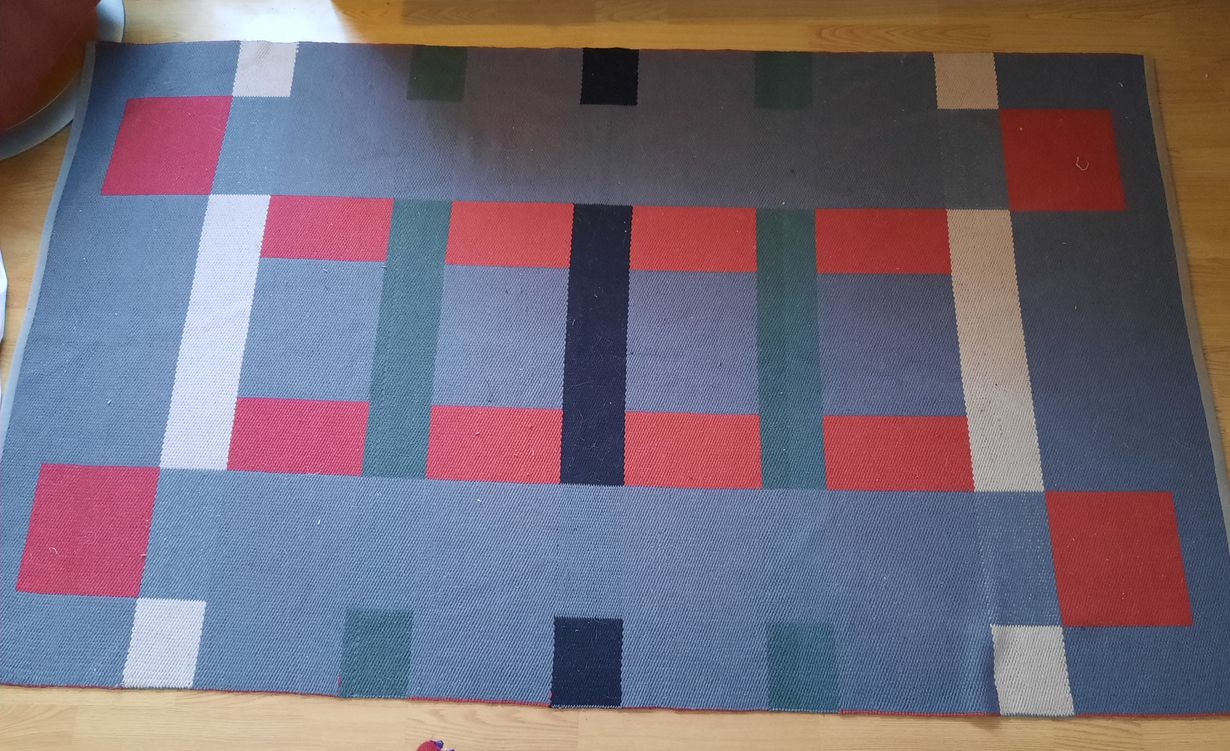 Edesmenneen käsityöläisäitini kutoma, villalankainen kääntömatto, jonka toisella puolella punainen ja harmaa ovat vaihtaneet paikkaa. Vaihtelua sisustukseen puolivuosittain!