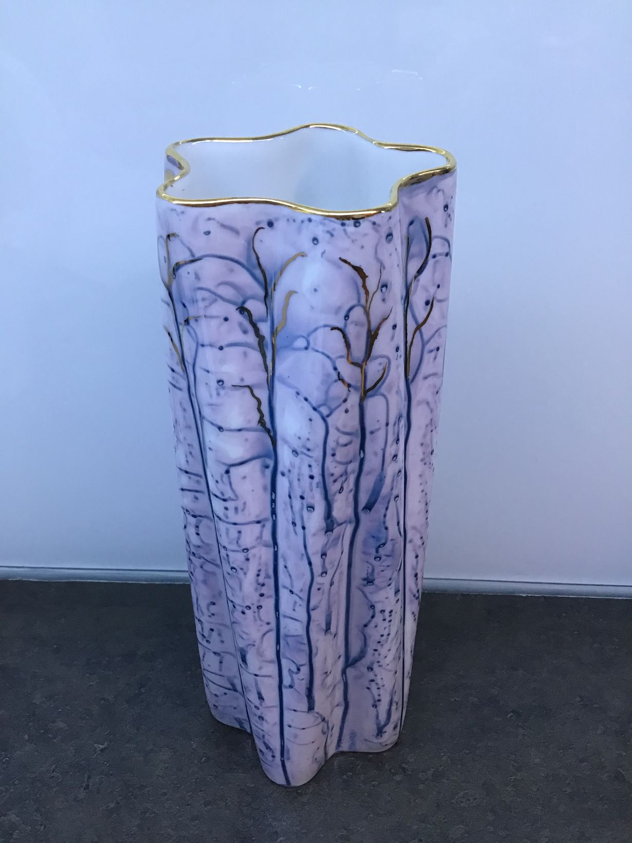 Minun jo edesmennyt äitini harrasti posliininmaalausta. Hän maalasi tämän maljakon lisäksi koko 12 h kahviastiaston ja kahvikannunkin minulle samalla värillä.