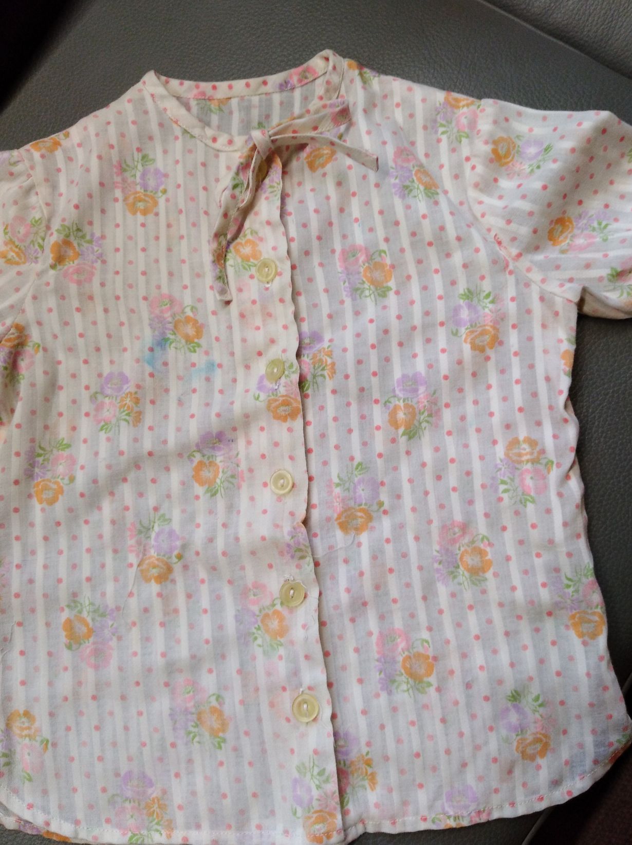 on tämä vanhin vaatteeni, ihanan hempeä kesäpaita vuodelta -75. Puin sen päälleni tokaluokan luokkakuvaan ihanien papiljottikiharoiden seuraksi. Välillä paitani oli lainassa isosiskoni esikoisella mutta onneksi sisko älysi jemmata sen ja palautti aarteeni vuosia sitten minulle takaisin.