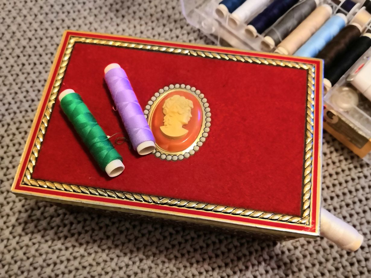 Äitini inhosi ompelua, mutta silti kuva hänestä ompelemassa piirtyy mieleeni helposti. Olen myös säästänyt hänen ompelurasiansa. Rasia on chymoksen kameerasia, joka on sisältänyt 400g Julia konvehteja.