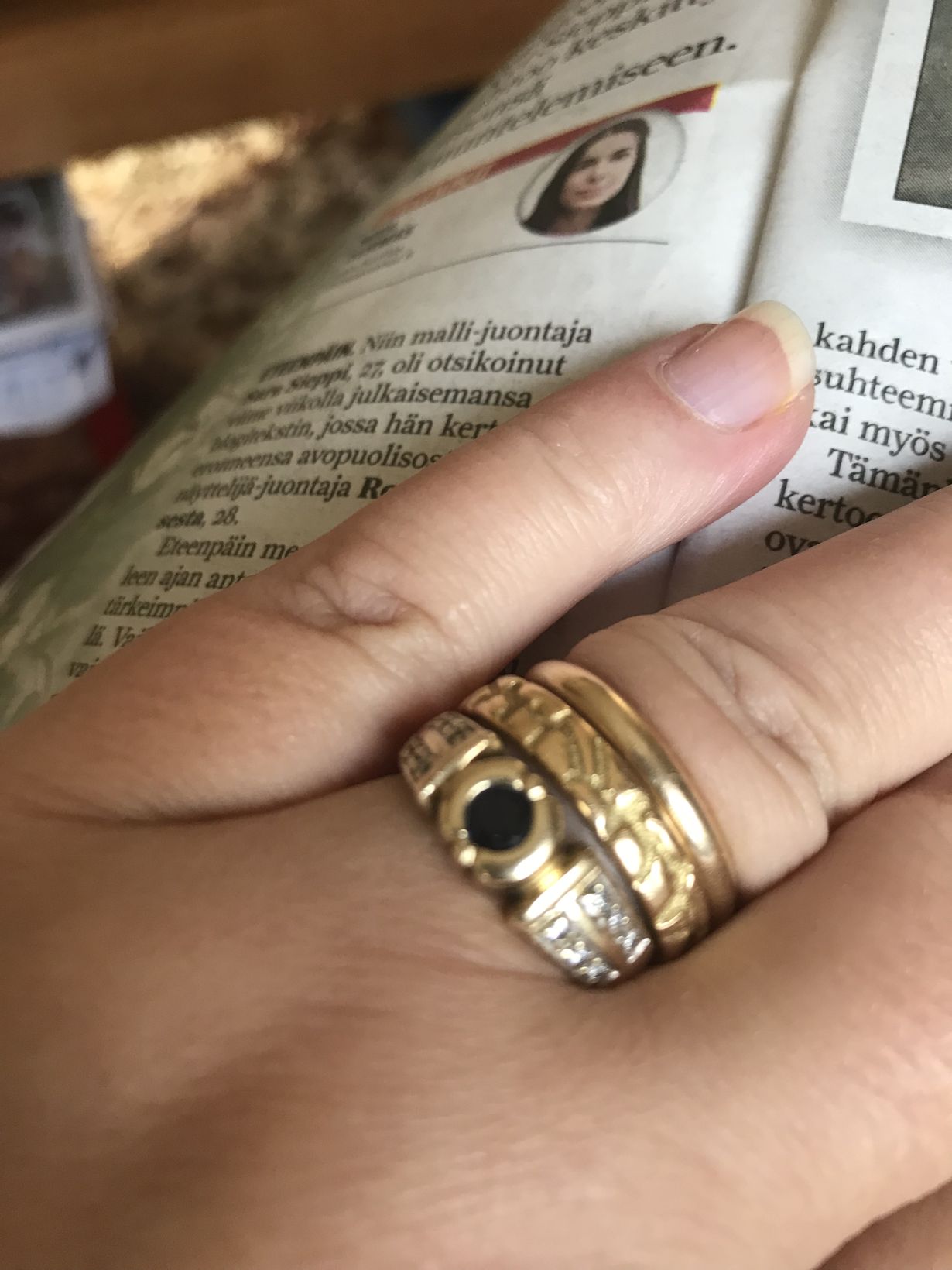 Isäni osti joskus kolmekymmentä vuotta sitten oheisen sinisafiirisormuksen äidilleni joululahjaksi. Äiti piti sormusta pikkurillissä. Minusta sormus on aina ollut kaunis. Perin sormuksen äidiltäni ja se on aina sormessani. Muisto äidistä.