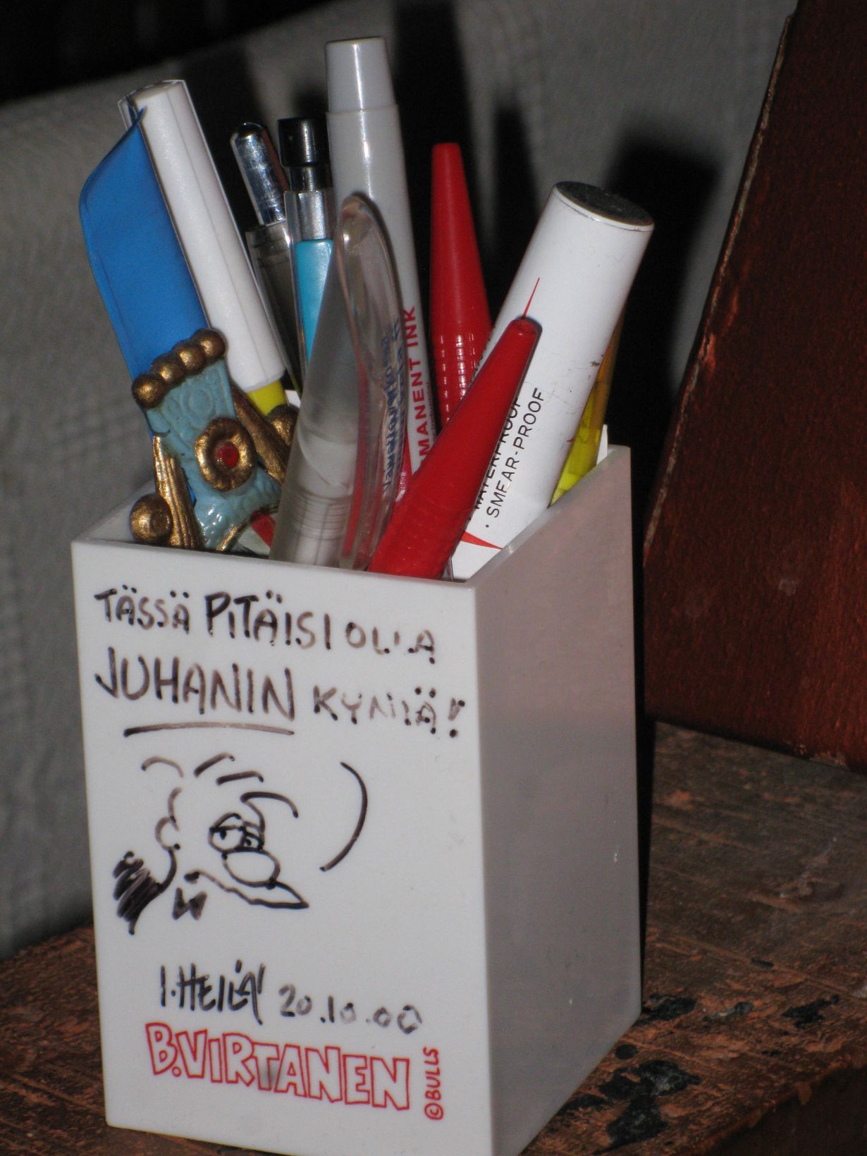 Mieheni väittää, että "pöllin" hänen kynänsä. Siksi ostin hänelle tämän kotelon, jossa on ainut sarjakuvapiirtäjän vähän jo kulunut teksti ja piirros.