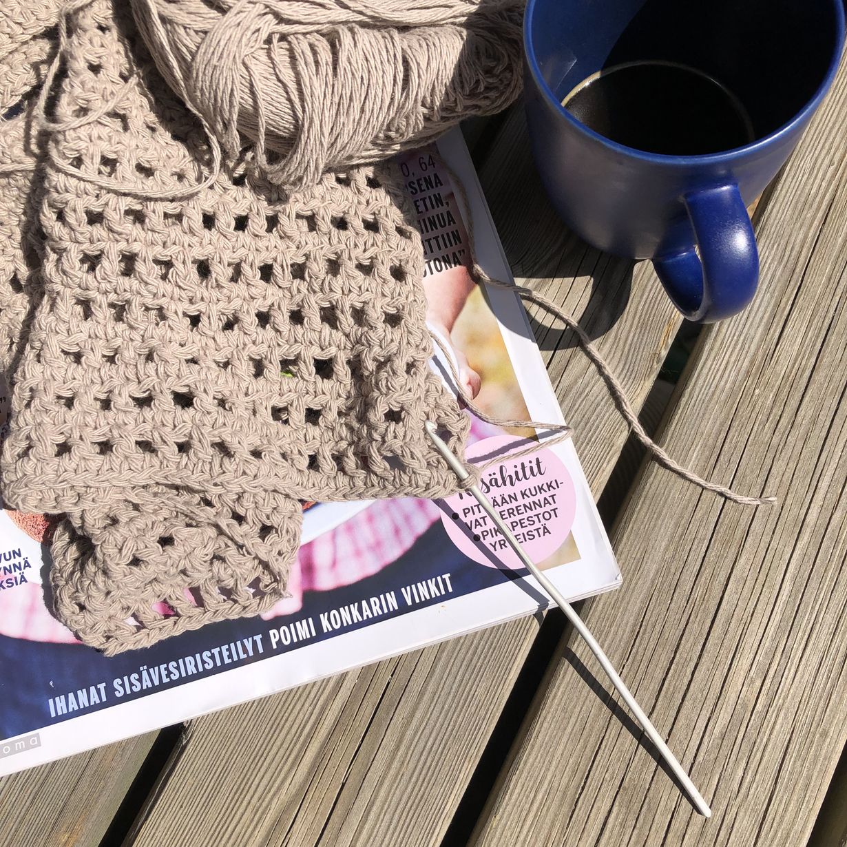 Talvisin heiluvat sukka- tai pyöröpuikko mutta kesäisin kaivan esiin vanhan metallisen virkkuukoukun, tänä kesänä isoäidinneliöt ovat vaihtuneet korikassiin. Pari kertaa koukku on melkein kadonnut terassin tai laiturin rakoihin mutta onneksi vain melkein!