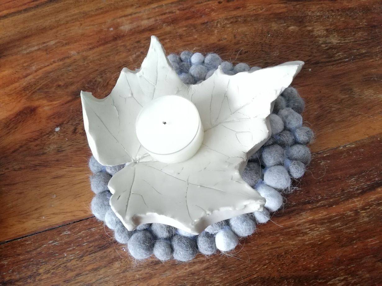 kuvassa 7- vuotiaan tyttäreni minulle lahjaksi savesta tekemänsä kynttilänalunen. Upea! Sen alla on itse tekemäni alunen. Pienet pallot on huovutettu kahden kissamme karvasta. Samalla kun iltaisin katselen tv:tä ja silittelen kissoja, pyörittelen pieniä palloja lähtevästä karvasta. Pallot ovat tarkoituksella jokainen aivan oman muotoisensa ja kokoisensa. Ne on liimattu kuumaliimalla yhteen. Tämä oli ensimmäinen tekemäni versio, joka jäi meille vain kotiin. Seuraavat syntyivät jo rutiinilla lahjoiksi. Nyt teon alla isompi "matto" sängyn viereen.