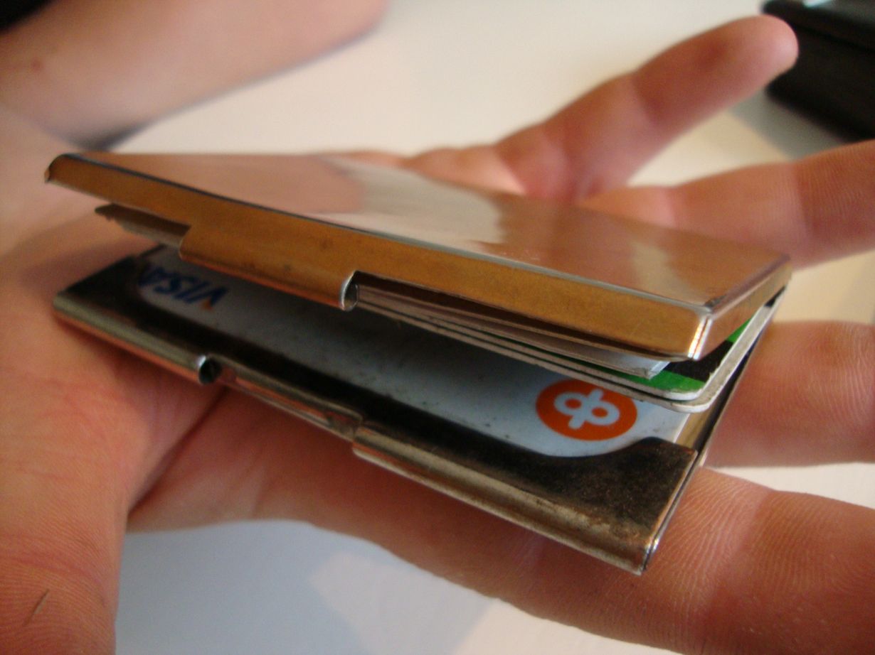 Mukana taskussa kulkee ainoastaan tärkeimmät kortit, jotka mahtuvat käyntikorttikoteloon. Pankkivirkailija nimitti "lompakkoani" aneemiseksi peltilätkäksi, kun hylkäsin hänen lainakylkiäisinä tarjoamansa mustan nahkalompakon.