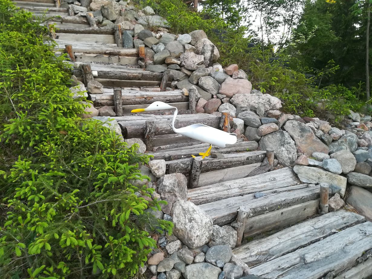 Muoviputkesta muotoilemani ankka haloista kyhäämilläni koristeportailla. Vieressä tienreunalta kaivetuista kuusentaimista istutettu kuusiaidanteen alku.
