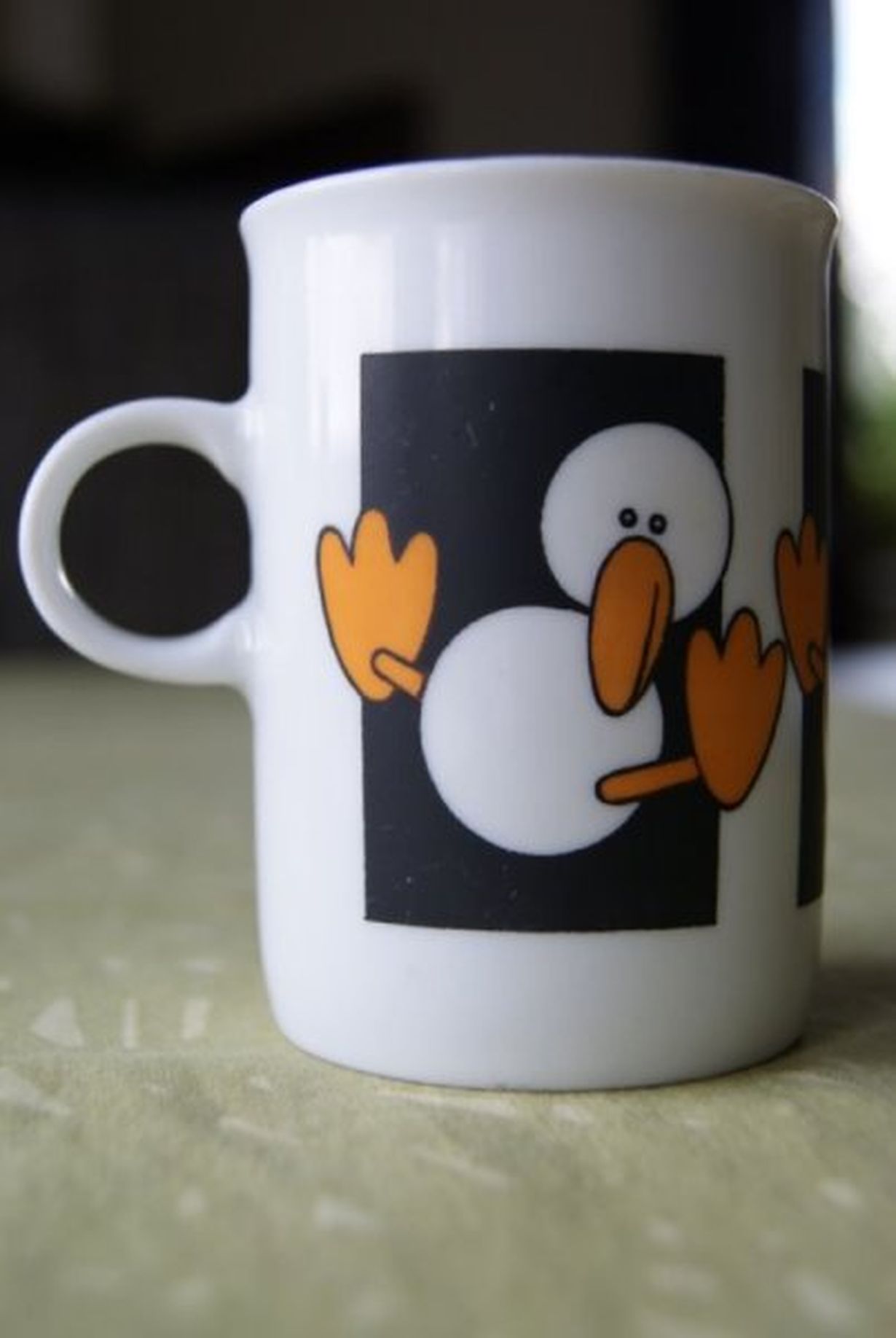 Sain mukin lahjaksi rakkaimmalta ystävältäni jo vuosia sitten. Edelleen muki ilahduttaa jokaista kahvihetkeä. Se on juuri sopivan kokoinen, ja iloinen kuva-aihe ja oranssit räpylät piristävät harmaanakin aamuna. Värit ovat jo haalistuneet ja pari kolhuakin on tullut, mutta mukia en vaihda!