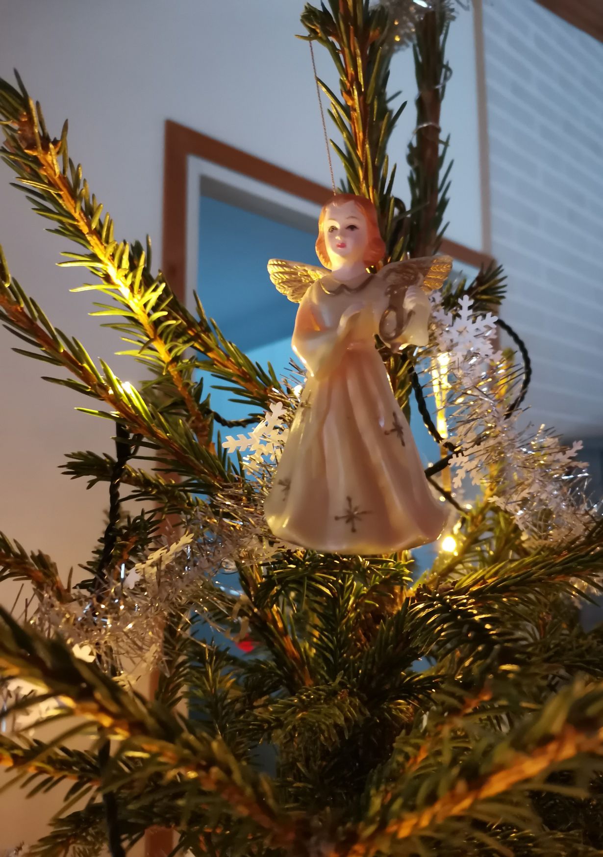 Edesmennyt anoppini antoi aikoinaan minulle kaksi muovienkeliä. Niistä toisen siivet ovat jo aikoja sitten tipahtaneet, mutta tämä pääsee kuuseen joka joulu aina ylimmälle oksalle tähden alapuolelle.
