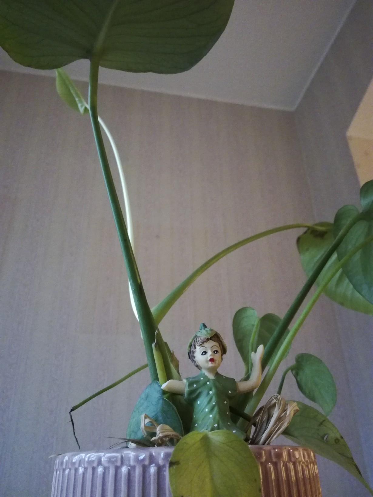 Kaunis peikonlehtemme oli kuukauden anopin hoivissa, ja palasi meille hieman kärsineenä. Peikonlehden juurelle oli myös ilmaantunut yksikätinen metsänhaltija!
