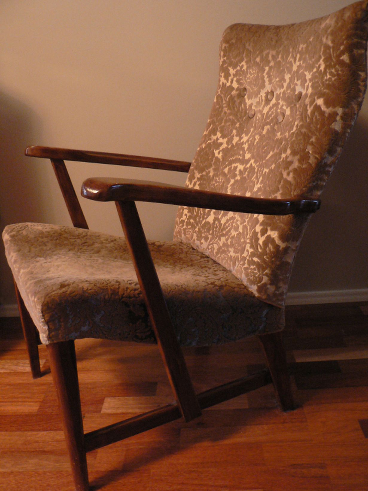 Tämä ihana muotovalio, jossa kaiken lisäksi on hyvä istua, on alun alkaen kälyni Antonin löytö. Hän hankki sen itselleen Tamperelaisesta osto- ja myyntiliikkeestä. Kun hänelle tuli muutto ajankohtaiseksi, teimme tarjouksen tuolista ja saimme sen itsellemme. Siitä lähtien, jo parinkymmenen vuoden ajan, on tuolimme kulkenut nimellä "Antonin tuoli".