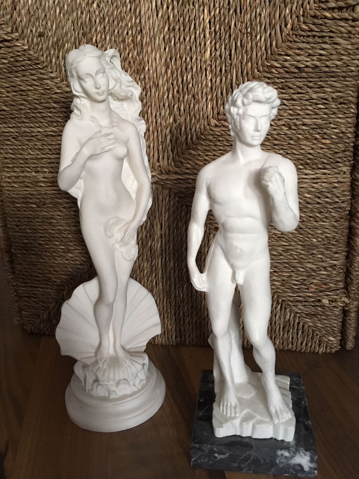 Ostin Aphroditen teininä Kyprokselta. Myöhemmin opiskelijana kiersin italialaisen ystäväni kanssa Italiaa ja hän osti firenzeläiseltä katukauppiaalta Aphroditelle poikaystävän, Daavidin. Mieheni inhoaa näitä syvästi, mutta minut ne saavat kitsch-olemuksellaan hyvälle tuulelle. Parasta on, että kauneuden jumalatar on isompi kuin sankari-Daavid!