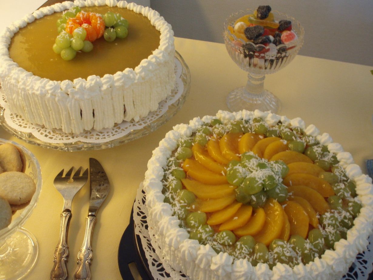 Nämä kakut ovat meheviä ja maukkaita. Suklaamoussetäytteinen appelsiini-suklaakakku vasemmalla, persikkamoussetäytteinen vaalea kakku oikealla. Vasen on bongattu lehdestä, oikean olen keksinyt itse. Ja juhlakakuissahan pitää olla kermaa! Kakut olivat tarjolla pääsiäisenä.