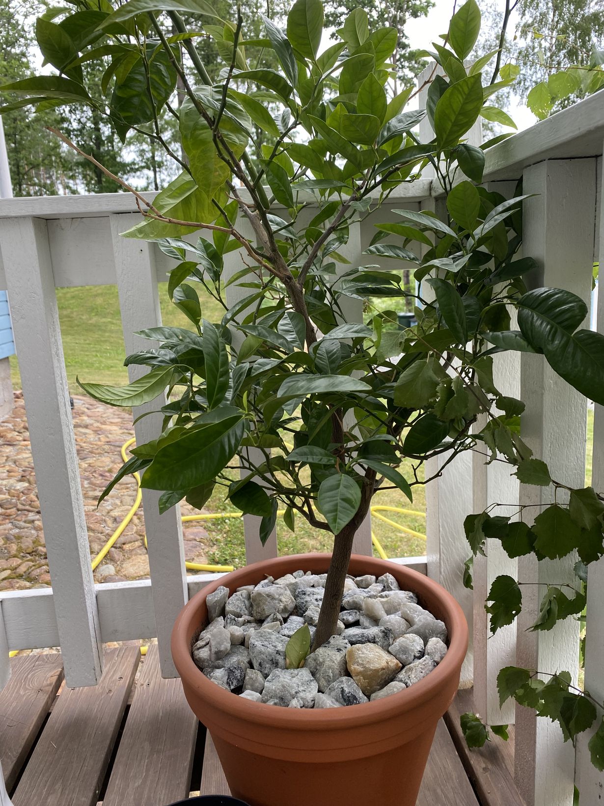 Olen kasvattanut tämän appelsiinipuun siemenestä noin 15 vuotta sitten. Kasvi on kesät terassilla, mutten jaksa itse ruukkua enää siirtää, joten kuva on terassin kaiteen pielestä.