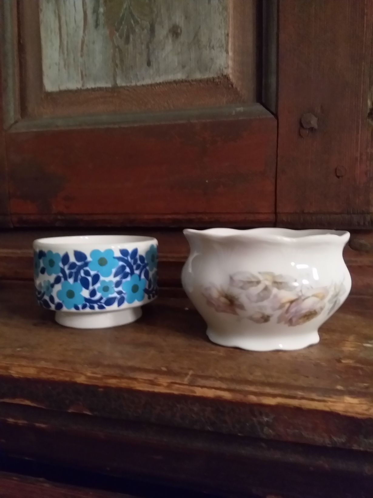 Käytössäni on kaksikin sokerikkoa, jotka olen perinyt alunperin isoäidin keittiöstä. Ruusukuvioisessa on useimmiten tarjolla teepusseja, sinisessä joskus sokeria.