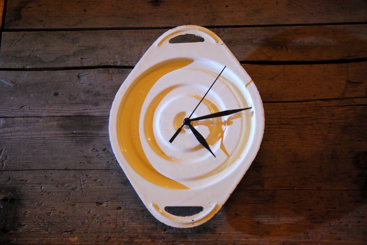 Kun taustalta kuuluu raksutus, tietää olevansa kotoisassa tilassa. Käytöstä unohdettu, vanha emalikattilan kansi sai uuden elämän keittiö kellona. Viipyvä katseeni kohtaasen edelleen monta kertaa päivässä. Rakkautta ensi silmäyksellä.