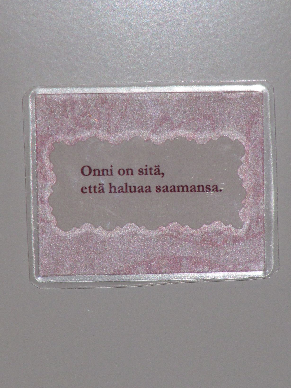Tämä ihana arki: jääkaappimagneetti Arjen iloa 12.12.2013 klo 19:27 Myyjäisistä löytynyt skräbätty magneetti muistuttaa kauniisti tyytyväisyyden ja hyväksymisen merkityksestä. hester
