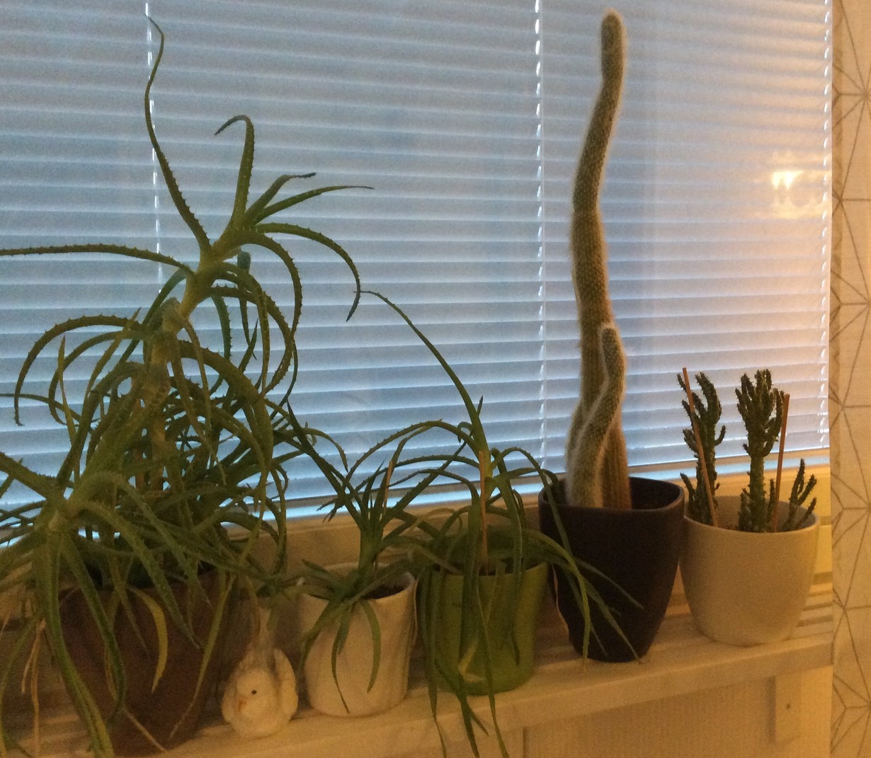 Tällä ikkunalaudalla aloet ja kaktukset viihtyvät. Korkeammat ruukut ovat pitkän etsinnän tulos, koska vain alhaalta kapeat ruukut mahtuvat ikkunalaudalle.