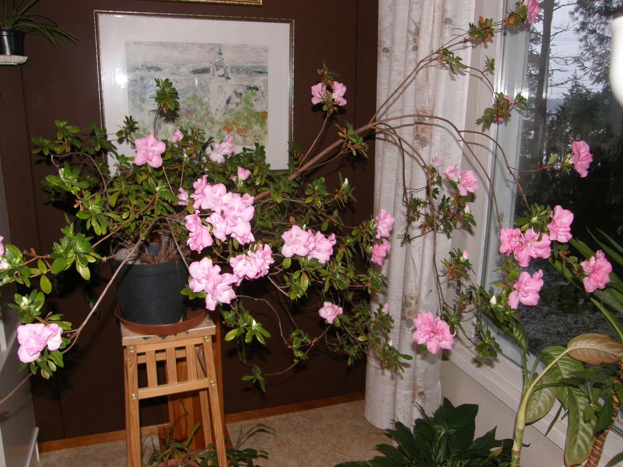 Tämä atsalea kukkii komeasti joka talvi kun se on kesän ulkona saamassa aurinkoa,