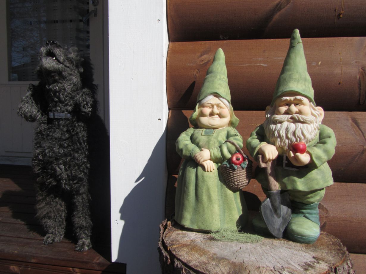 Saunatontut tervehtivät saunaan tulijoita mökkimme terassilla.
