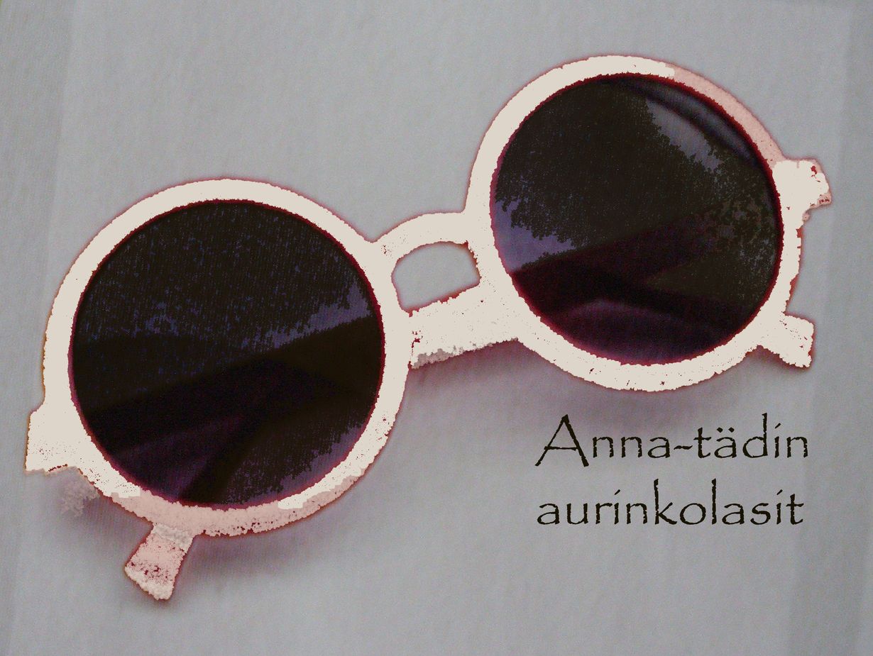 Nämä lasit kuvasin kiireessä lehdestänne, fotoshoppasin ja tyrkkäsin tulemaan, tarinan tähden: Anna-täti hoiti meitä lapsia arkisin. Sunnuntaina hän laittoi valkosankaiset, mustat aurinkolasit päähän, kaivoi kompostista kastematoja, heitti ongen olalle ja kiipesi rantakivelle onkimaan. Se oli Anna-tädin omaa aikaa, lasit loivat yksityisen tilan, ja silloin Annaa ei uskaltanut häiritä. Anna sai saaliiksi kymmensenttisiä sinttejä, keitti ne suolavedessä ja söi selät.