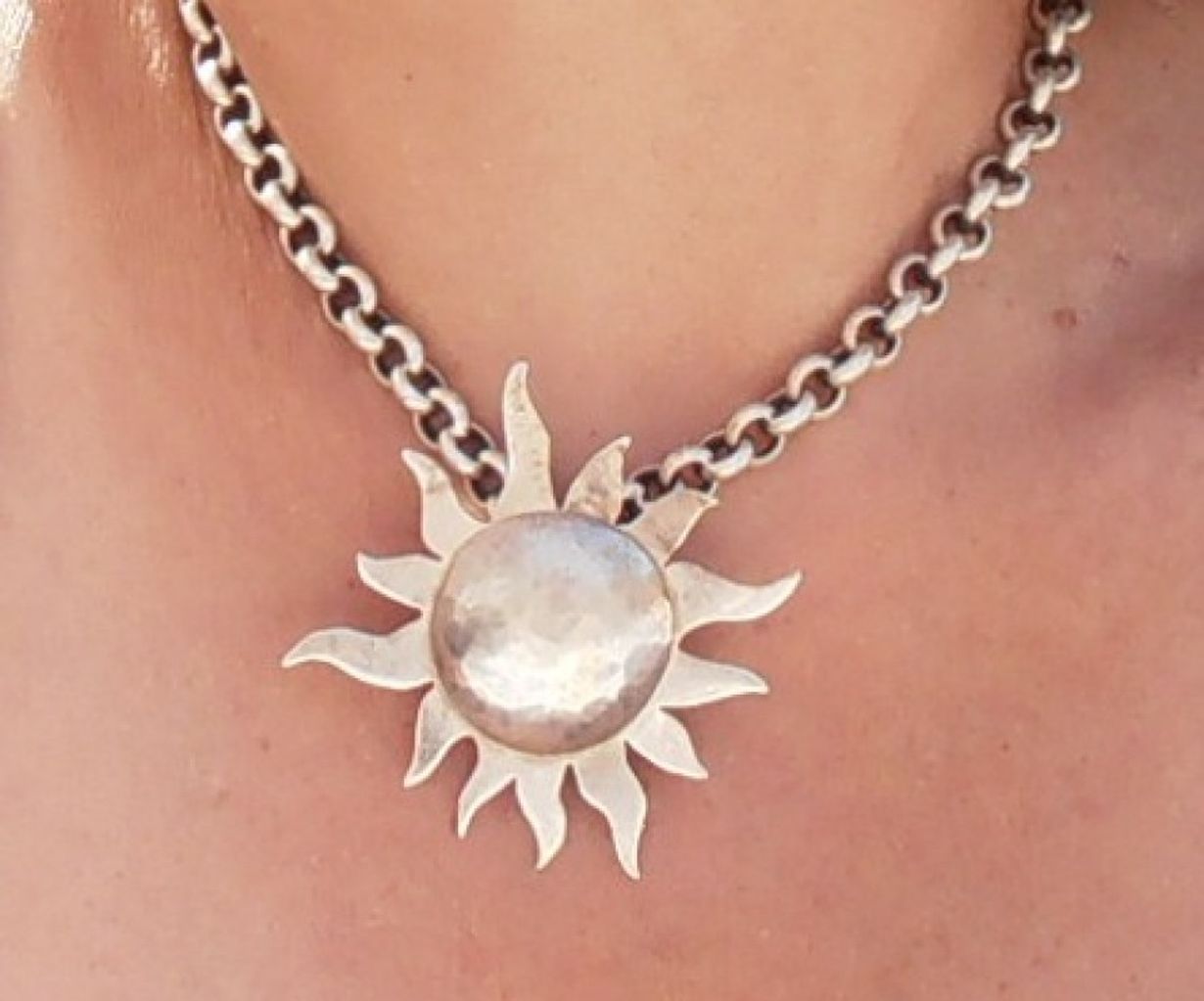 Tämä ihana arki: kaulakoru Aurinkoni 1.9.2012 klo 15:32 Tyttäreni minulle äitienpäivälahjaksi takoma hopeinen aurinkorintaneula, jota käytän papuketjussa kaulakoruna. Leila