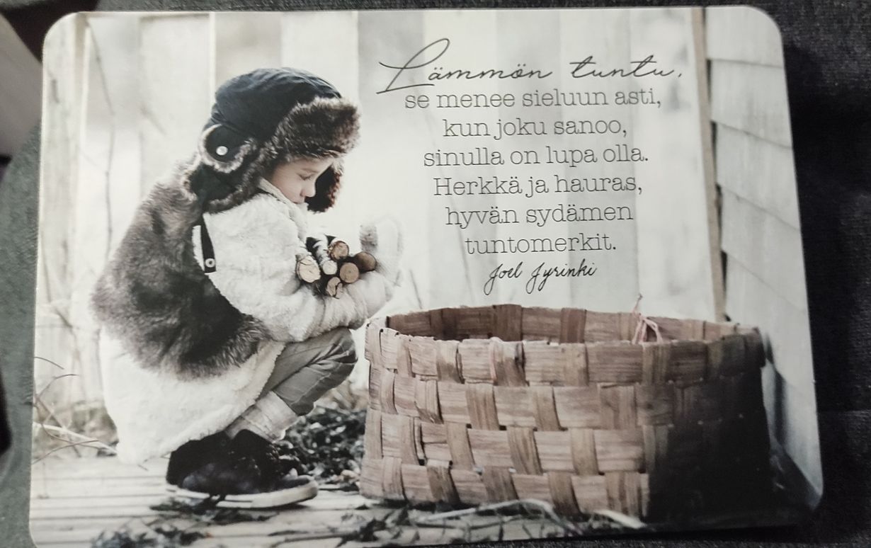 Olen säilyttänyt kortin, sillä harvoin olen kiitosta saanut mistään, vaikka olen hyväsydäminen ja etenkin heikommista huolehtiva ihminen. Kortti kävi tunteisiini ❤️ja vieläkin on tuo tuntematon pieni Jimi-poika tervetullut pyytämään apua ja siskonsa myös, jos pitkä koulumatka tuntuu liian raskaalta.