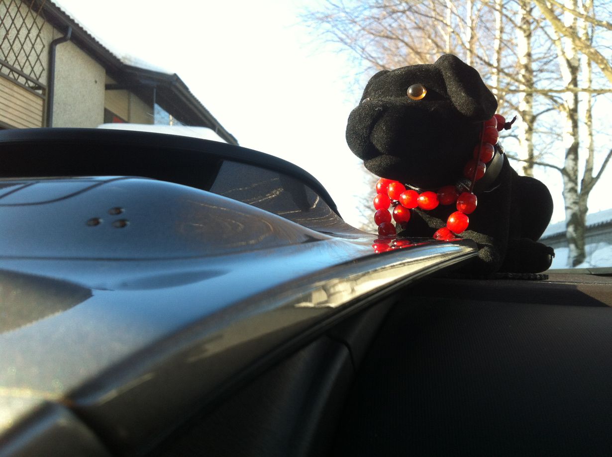 Pikkumusta päänkeikuttajakoira pääsi parhaalle paikalle toisen pikkumustan, Toyota IQ:n kojelaudan päälle. Siinä se katselee minua iloisesti työmatkoillani kiiltävillä silmillään kaulassaan tyttäreni Rhodokselta tuoma rukousnauha.