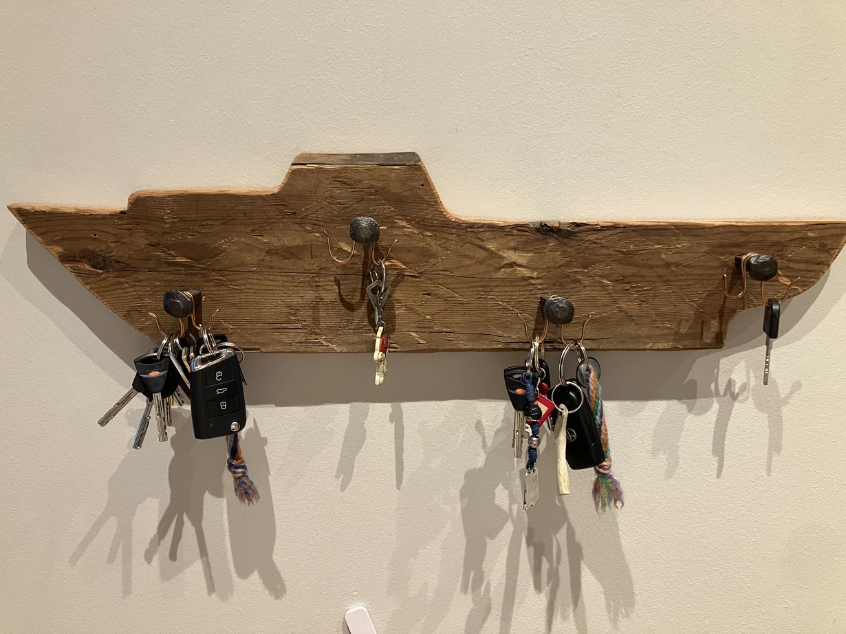 Tämä appiukon joululahjaksi tekemä avainnaulakko on tehty vanhasta seinälaudasta ja vanhoista nauloista. Kierrätystä parhaimmillaan ja kaunis lopputulos