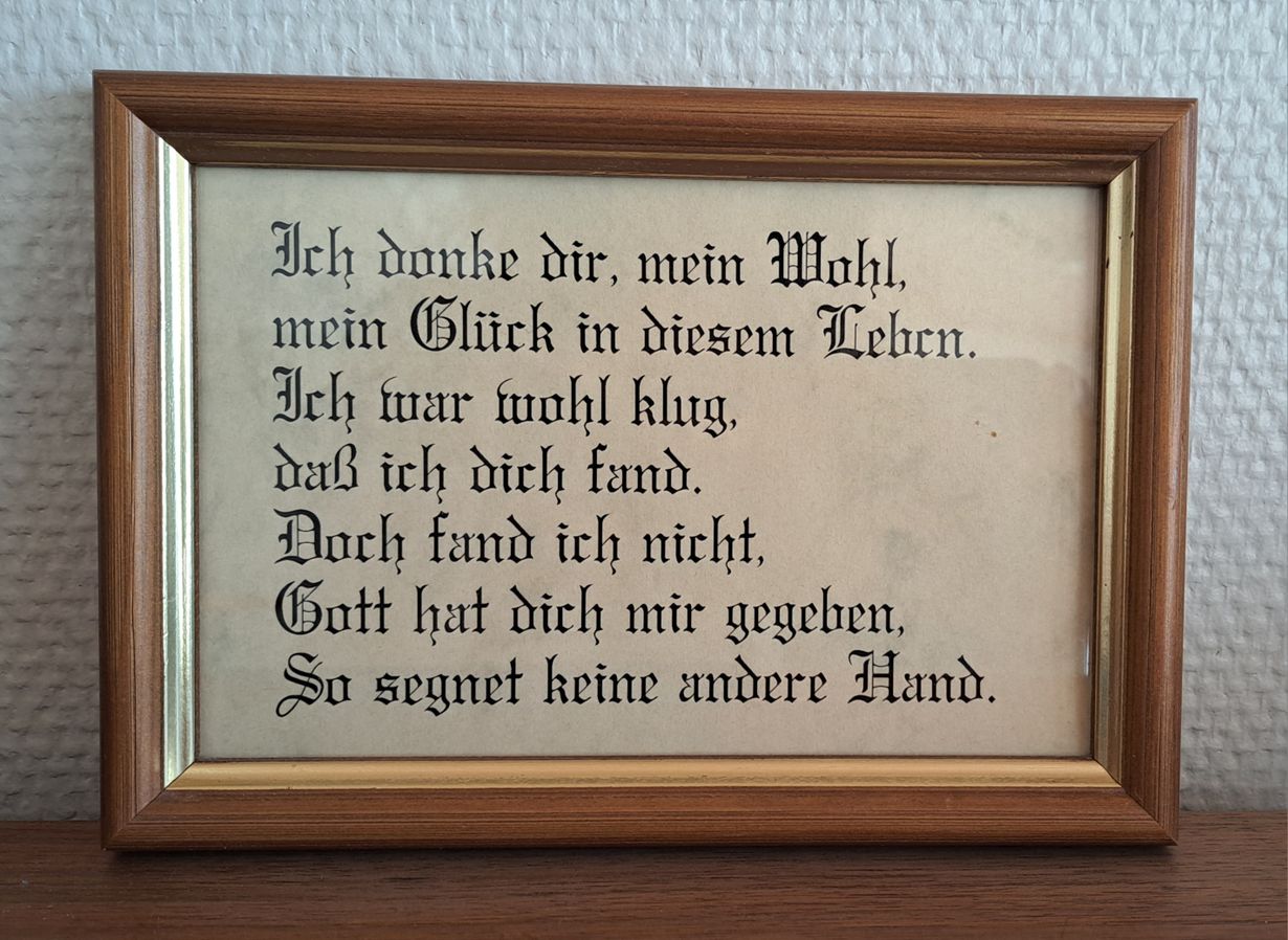 Aviomieheni vei sveitsiläisestä kirkosta löytämäni runon käsinkirjoittajalle ja kehystämöön ja antoi taulun minulle yksivuotishääpäivälahjaksi vuonna 1997. Nimimerkki: So segnet keine andere Hand