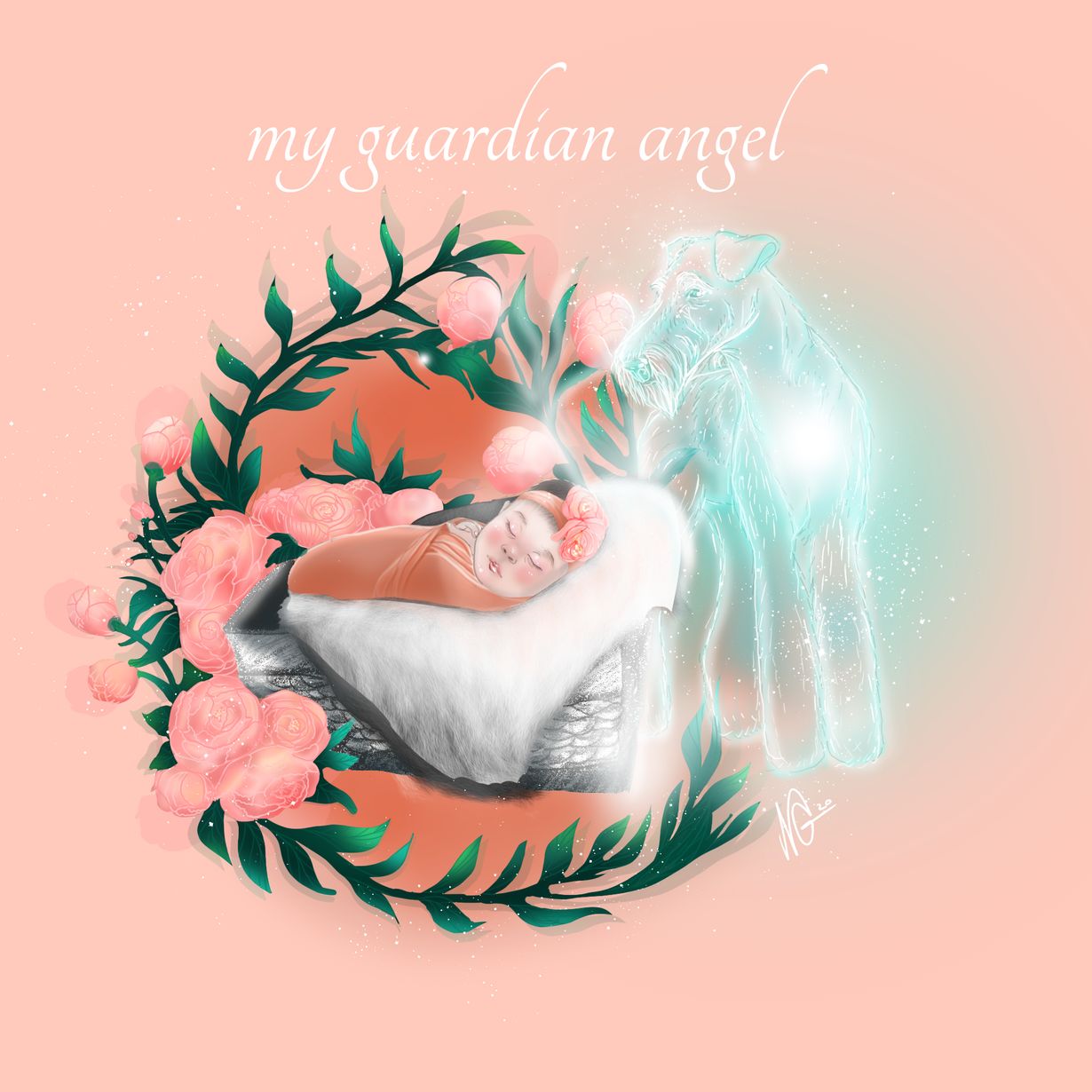Piirsin julisteen poikani kummeille jotka menettivät koiransa edellisenä vuotena ja pitkä yrityksen jälkeen odottavat nyt tyttövauvaa.