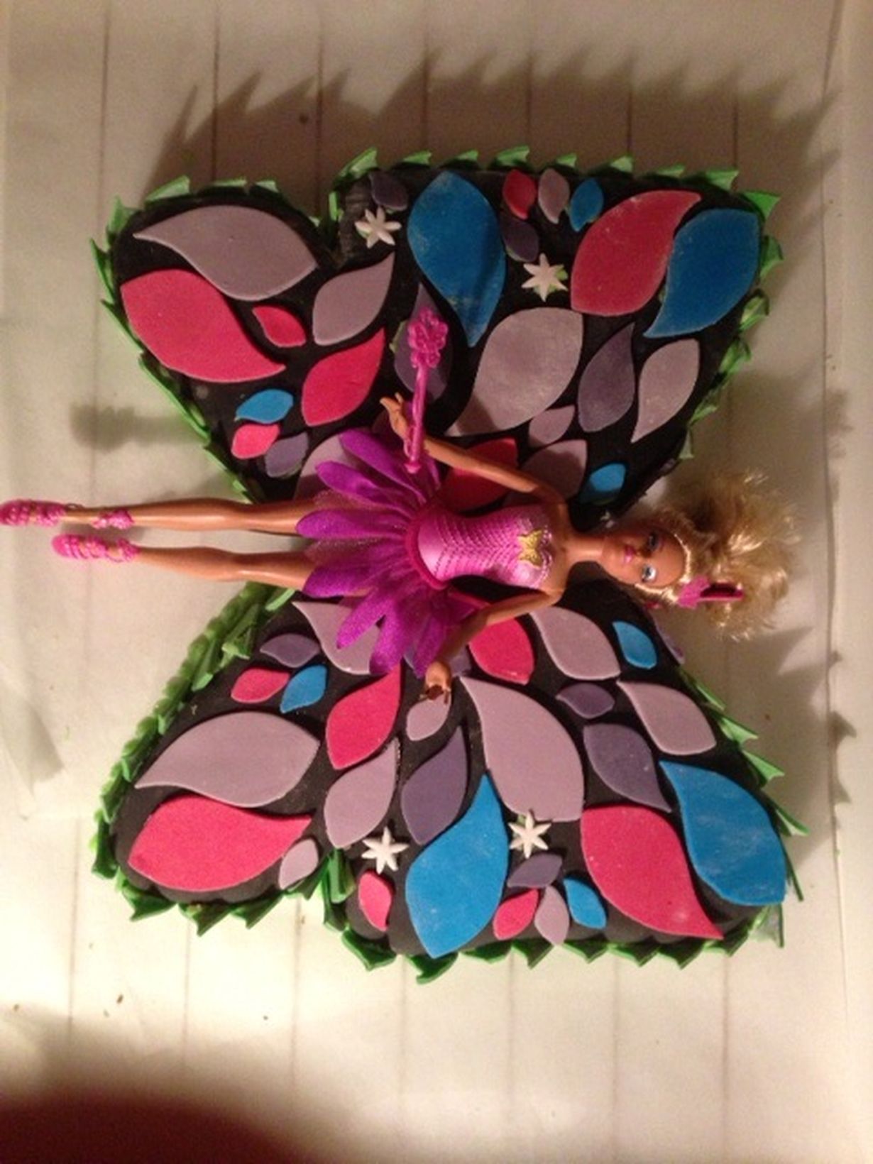 Siskon tytöllä oli toive joko barbi- tai perhoskakku. toteutin molemmat toiveet ja lahja on tuo barbie kakun keskellä.