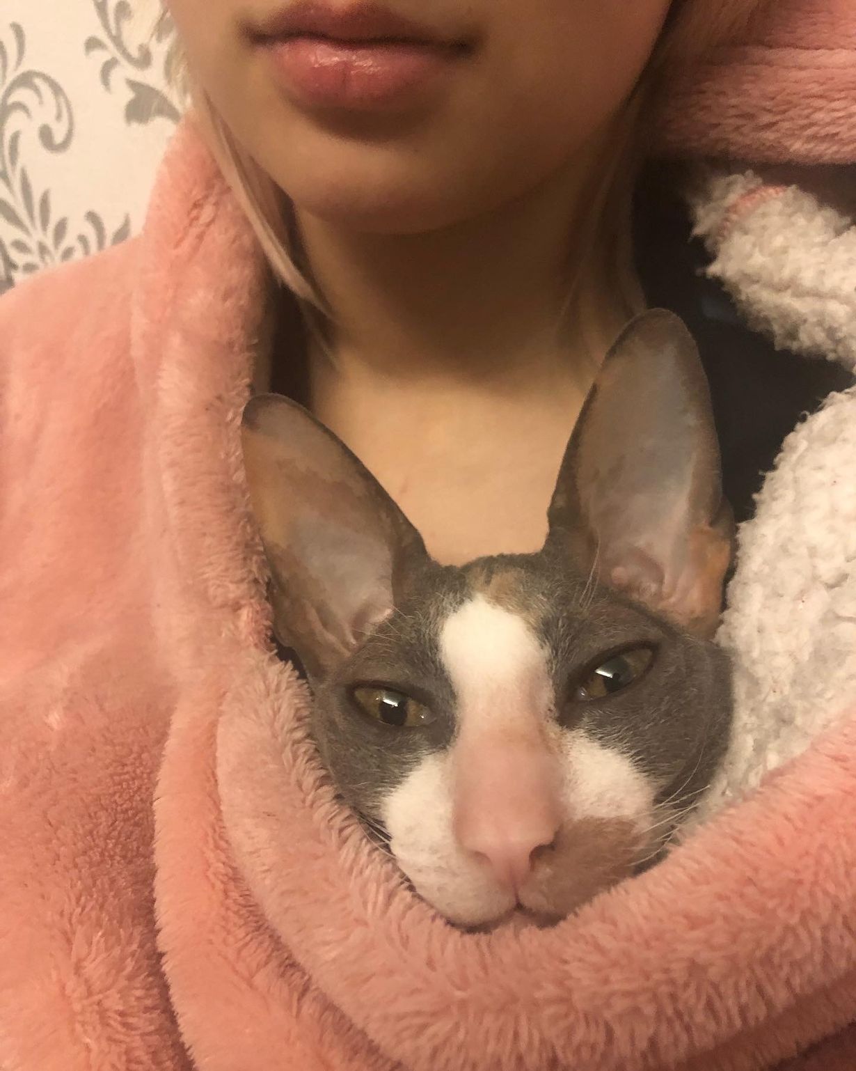 Bella on meidän cornish rex rotuinen 11-vuotias kissamme. Bella rakastaa, jos ruokaa ei lasketa, eniten maailmassa ihmisten seuraa ja lämpöä. Parasta on, jos pääsee kauluksesta sisään ja paidan alle nukkumaan.