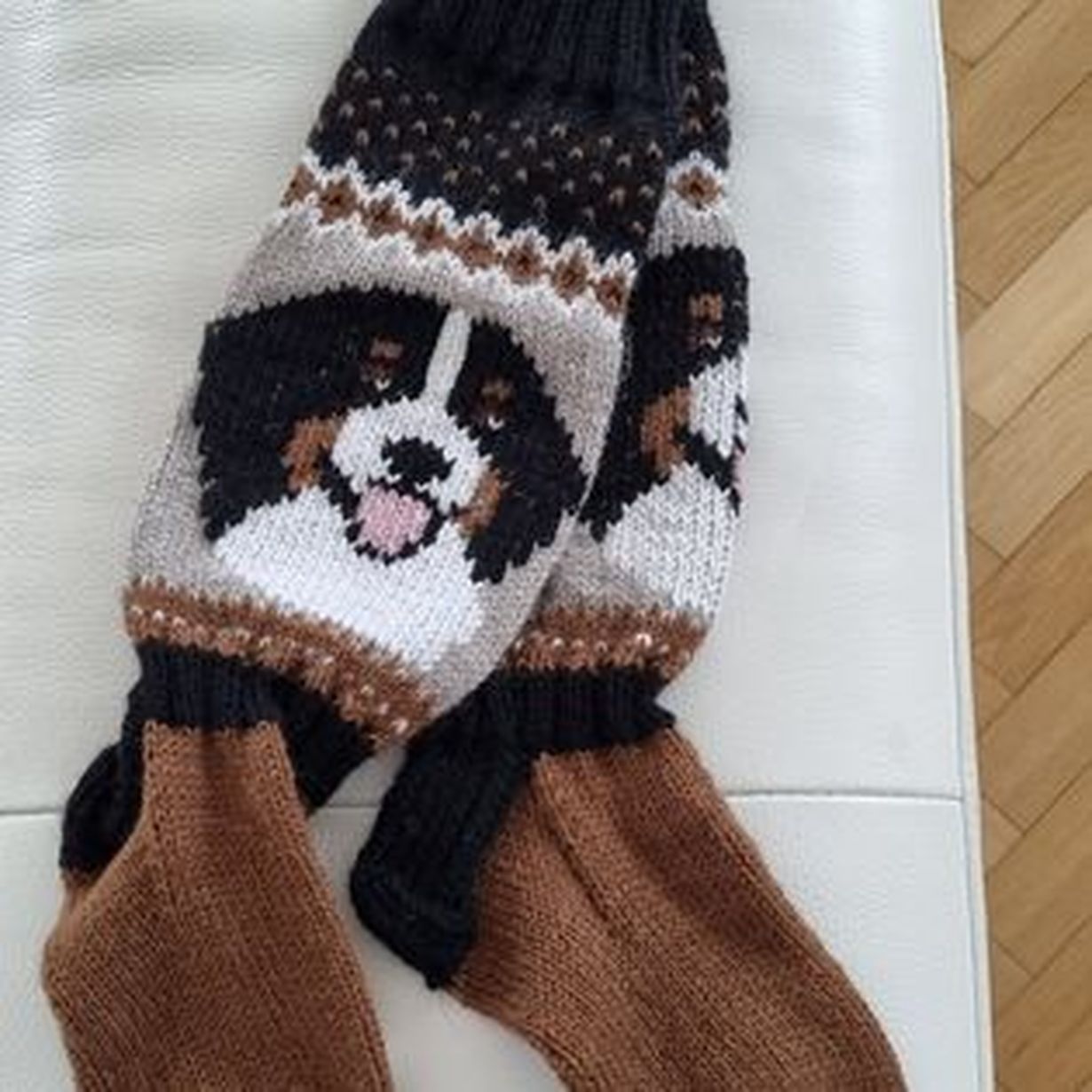 Tyttäreni, berninpaimenkoiran omistaja, tahtoi sukat ja toi minulle ohjeen. Yksinkertaistin hieman sitä, mutta mieleiset niistä taisi silti tulla.