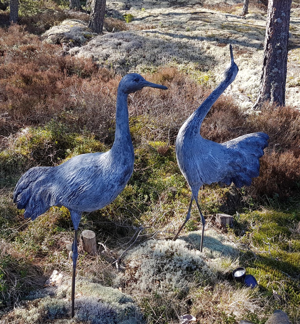 Kansalaisopiston puutarhaveistoksia kurssin innoittamana olen valmistanut pihamaalle koristeita betonista. Oheiset kurjet ovat pihallamme metsän reunalla.