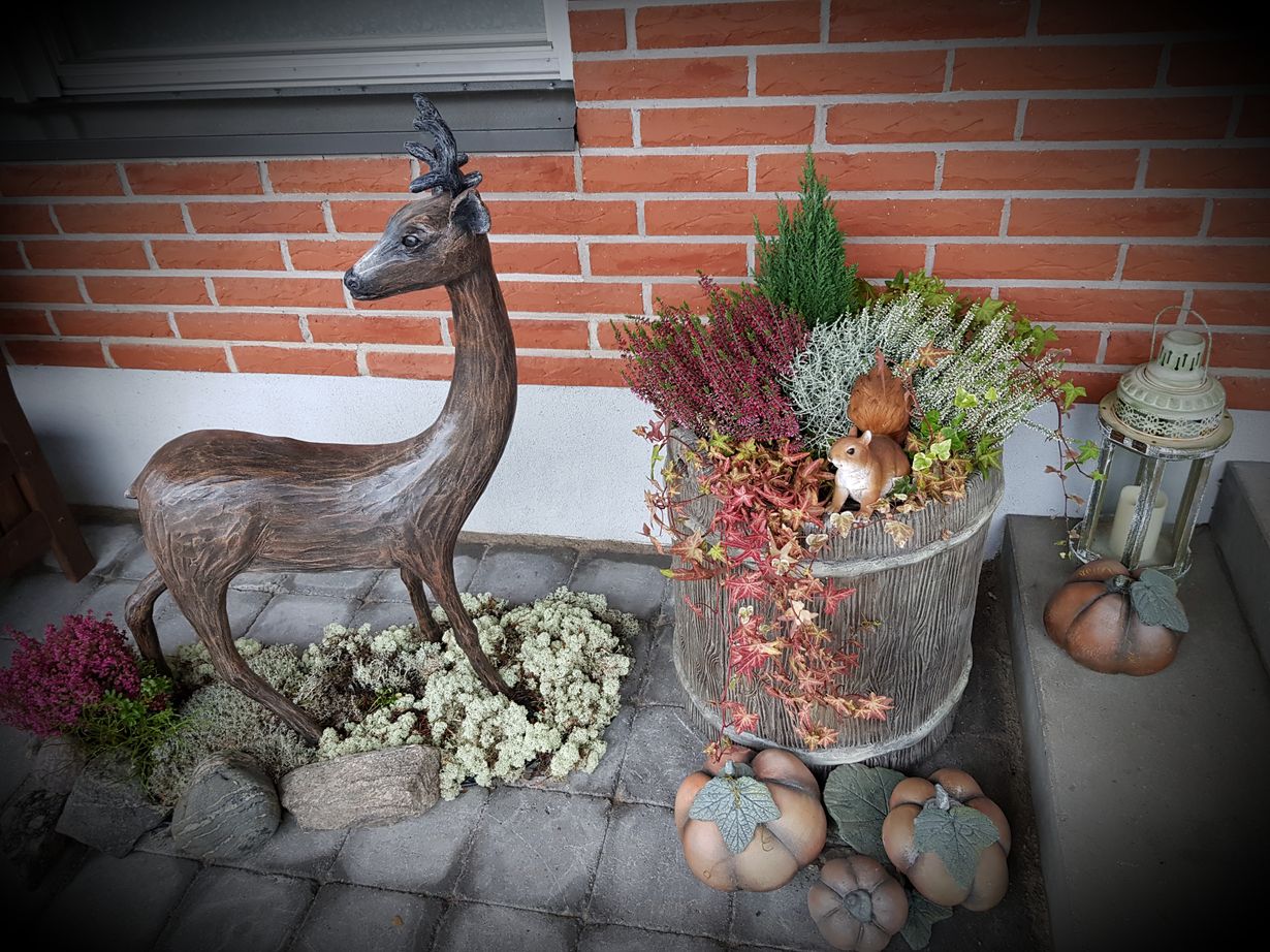 Kauris ja saavi ovat kansalaisopiston betoniveistoskurssilla metalliverkon päälle muotoilemiani tekeleitä. Betonikurpitsat ovat puolestaan kotosalla sukkahousujen avulla värkkäämiäni.