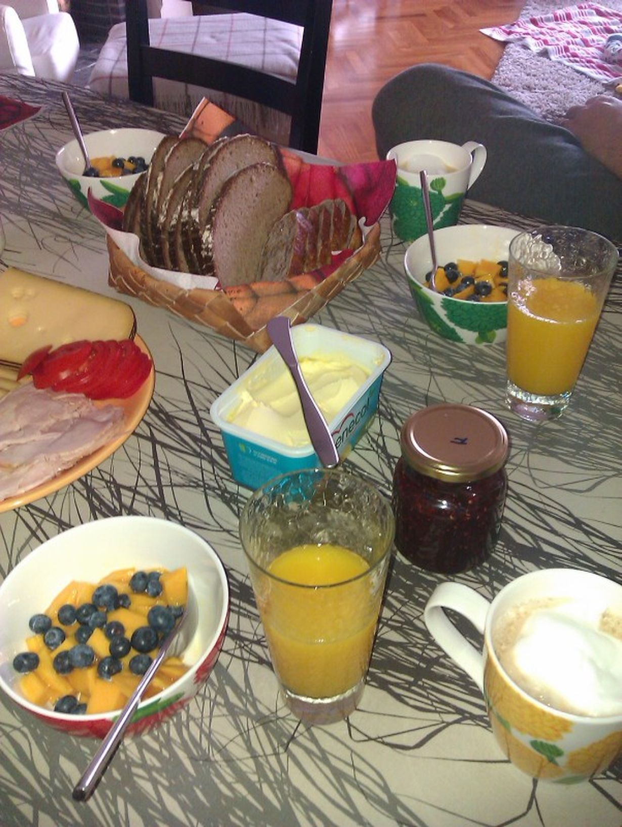 Tuoretta mangoa ja mustikkaa tai torikauppiaiden vadelmahilloa luonnonjogurtin kera, capuccinoa (sillä George Clooneyn mainostamalla kahvikoneella), saksanpähkinäleipää,sour dough-leipää ja leivän päälle: savustettua kalkkunaa, old amsterdamia, tomaattia ja ihanan kirpsakanmakeeta tuorepuristettua appelsiinimehua.. nam!