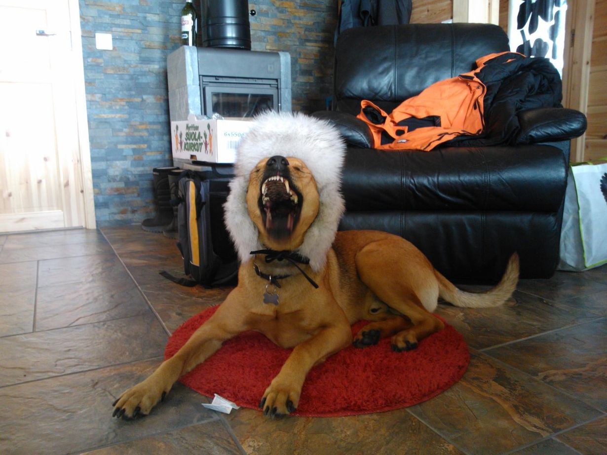 Kilpisjärven mökillä pitkän ulkoilupäivän jälkeen alkoi Buddyllakin kovasti haukotuttamaan. Karvalakki päässä oli niin kiva lämmitellä takan edessä.