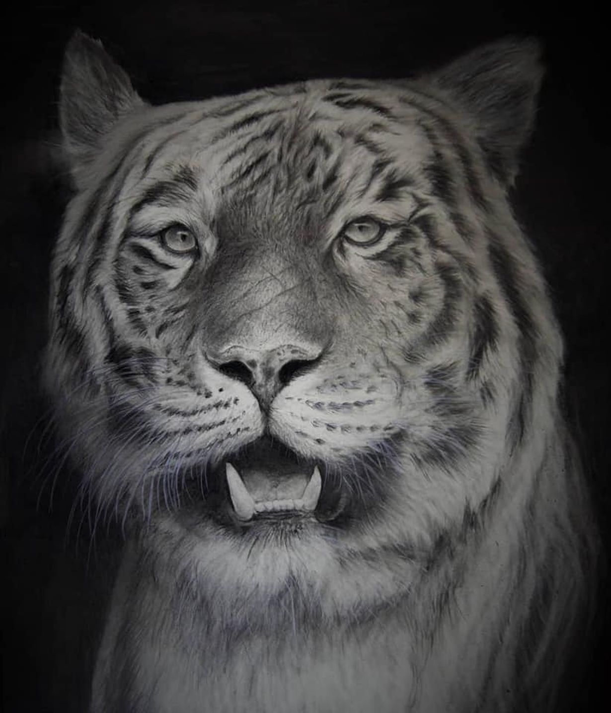Kuvan tiikeri on tehty hiilikynillä A2 kartongille. Tein sen, kun minulla oli elämässä paljon haasteita. Sain tuolloin paljon voimaa Tarantinonkin elokuvassa olleesta David Bowien Cat People -kappaleesta, ja kappale toimikin inspiraationa ko. kuvalle.