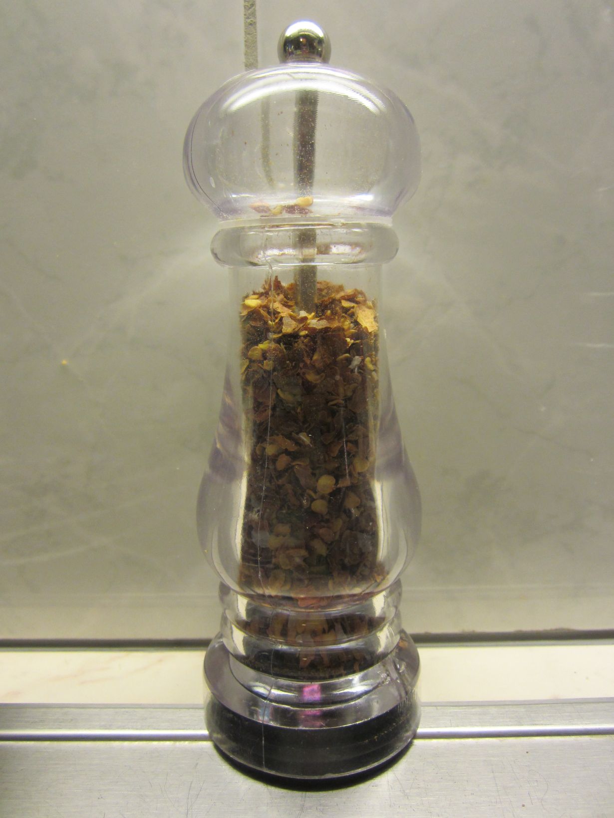 Minulla ei perinteistä suolasirotinta ole koskaan ollut, koska niin harvoin käytän pelkkää suolaa ruoanlaitossa. Kuvan maustemyllyssä on puolet sisällöstä chiliä ja puolet suolaa, kyseinen yhdistelmä antaa mukavan säväyksen vaikka suklaakakulle.