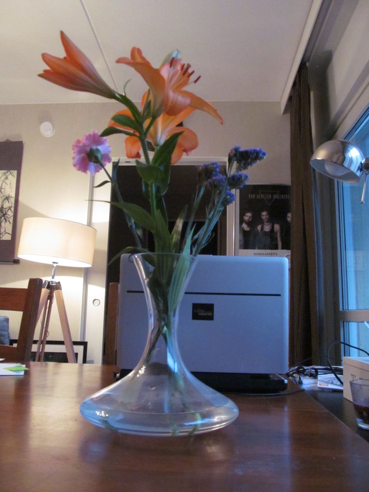 Kun tulin kotia, havaitsin kukkia viinidekantterissa, koska ei ollu tienny, missä kukkamaljakot on :) Mutta loistavastihan ne siihen sopii :)