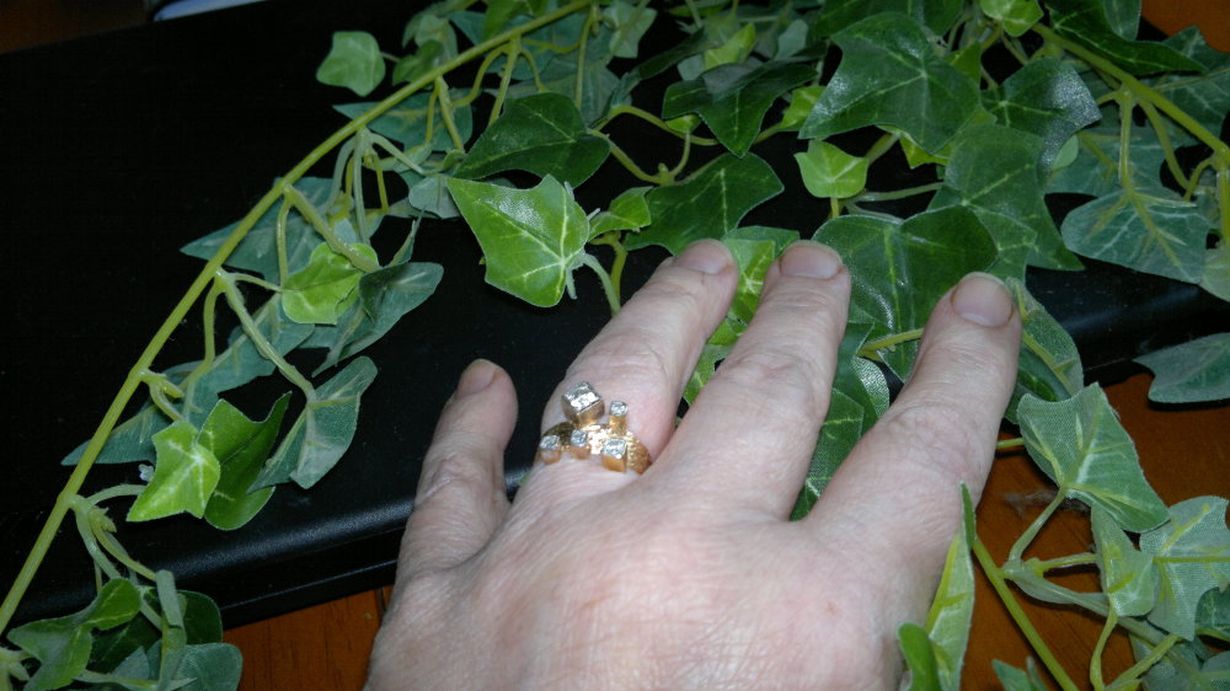Oma kultani ja kultaseppäni suunnitteli ja työsti sormukseni 1971. Alun alkaen siinä oli vain kolme pienintä timanttia. Vuosien vieriessä timantteja tuli kaksi lisää, yksi hieman suurempi ja yksi tosi suuri. Sormukseen hän kaiversi: Omalle kullalleni 6.12.1971.