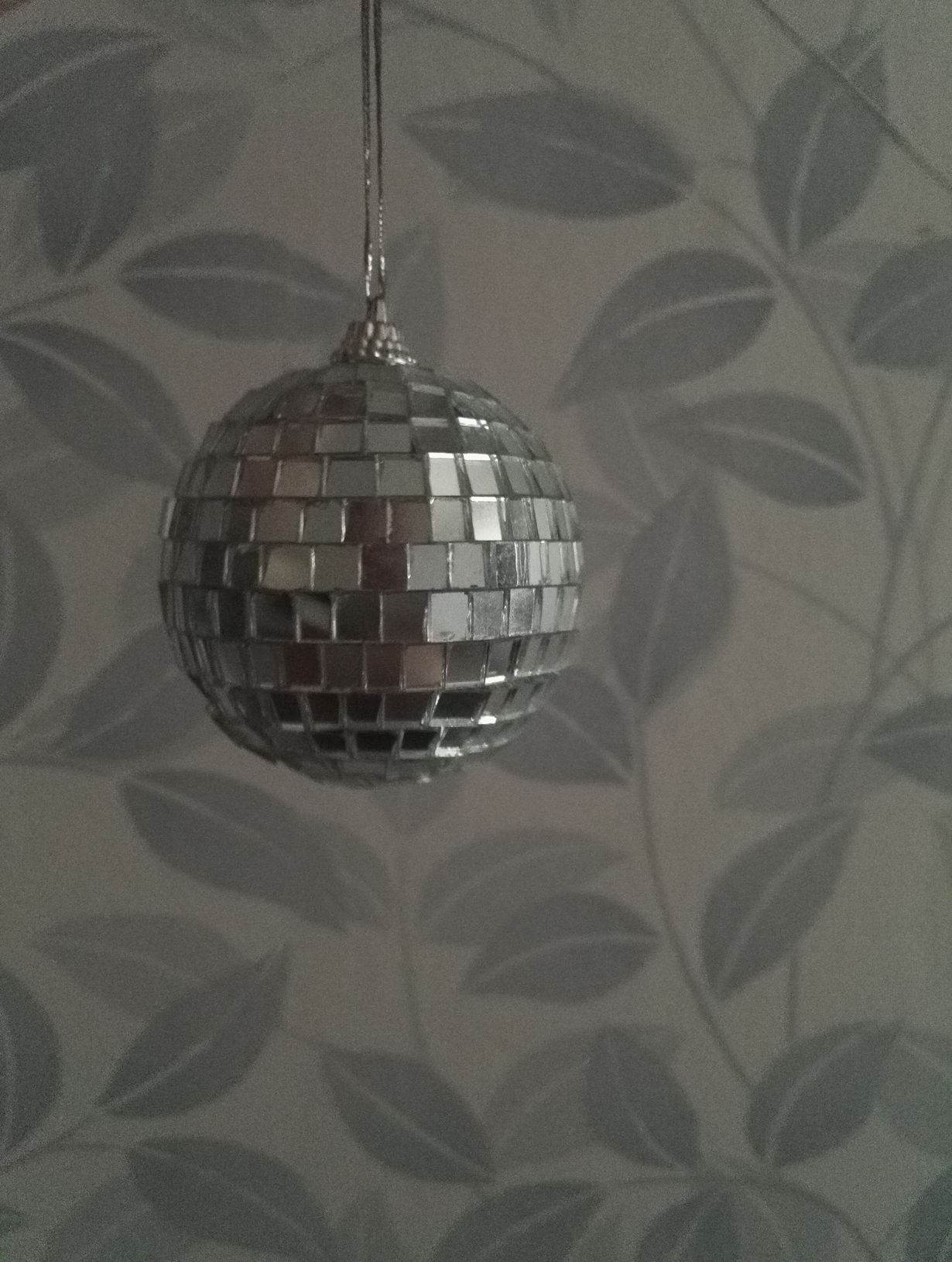 Kuvassa näkyy discojoulupallo, joka on osa pakettia jonka sain parhaalta ystävältäni kun olin vielä yläkoulussa. Harmikseni tämä on pakkauksen ainut joka on jäljellä. Erään muuton aikana paketille, jossa nämä koristeet olivat, kävi köpelösti. Onneksi sentään tämä säilyi ja muistot elävät. Parasta näissä oli kun kaikki valo heijastui niiden kautta ympäri huonetta.